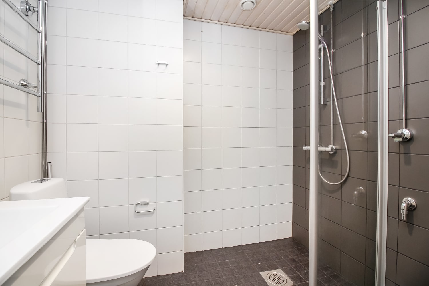 Kaakeloidussa pesuhuoneessa on tilaa pyykinpesukoneellesi.