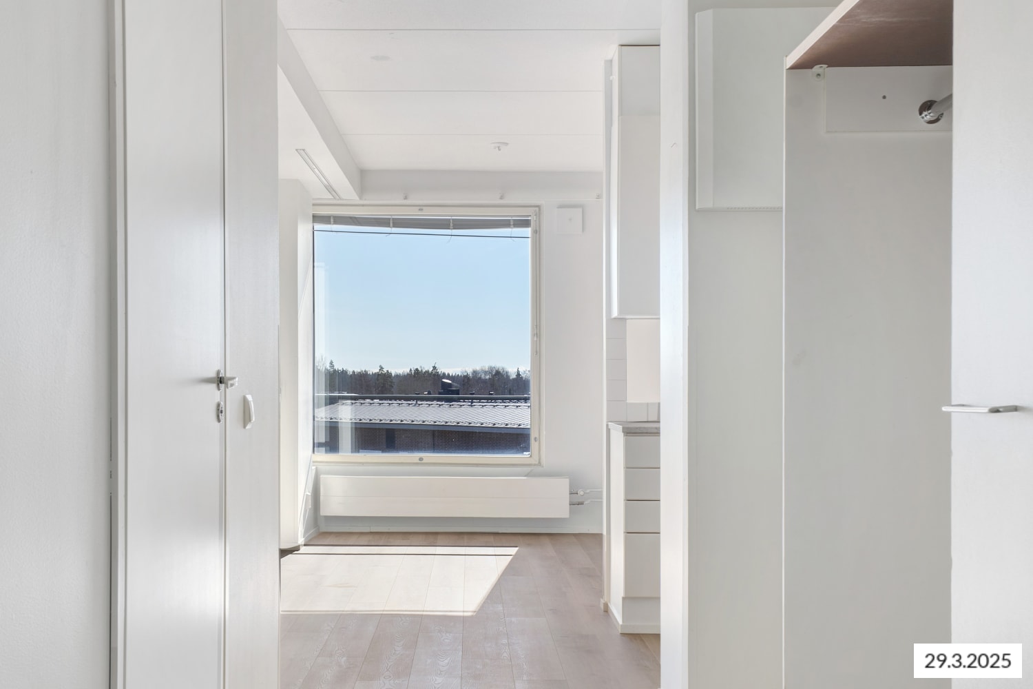Suuret ikkunat antavat runsaasti luonnonvaloa ja lisäävät tilan tuntua. Suojaisalla parvekkeella on mukava nauttia ulkoilmasta horisonttiin avautuvaa näkymää ihaillen. Neutraalin vaaleat lattia- ja seinäpinnat tekevät sisustamisesta helppoa.