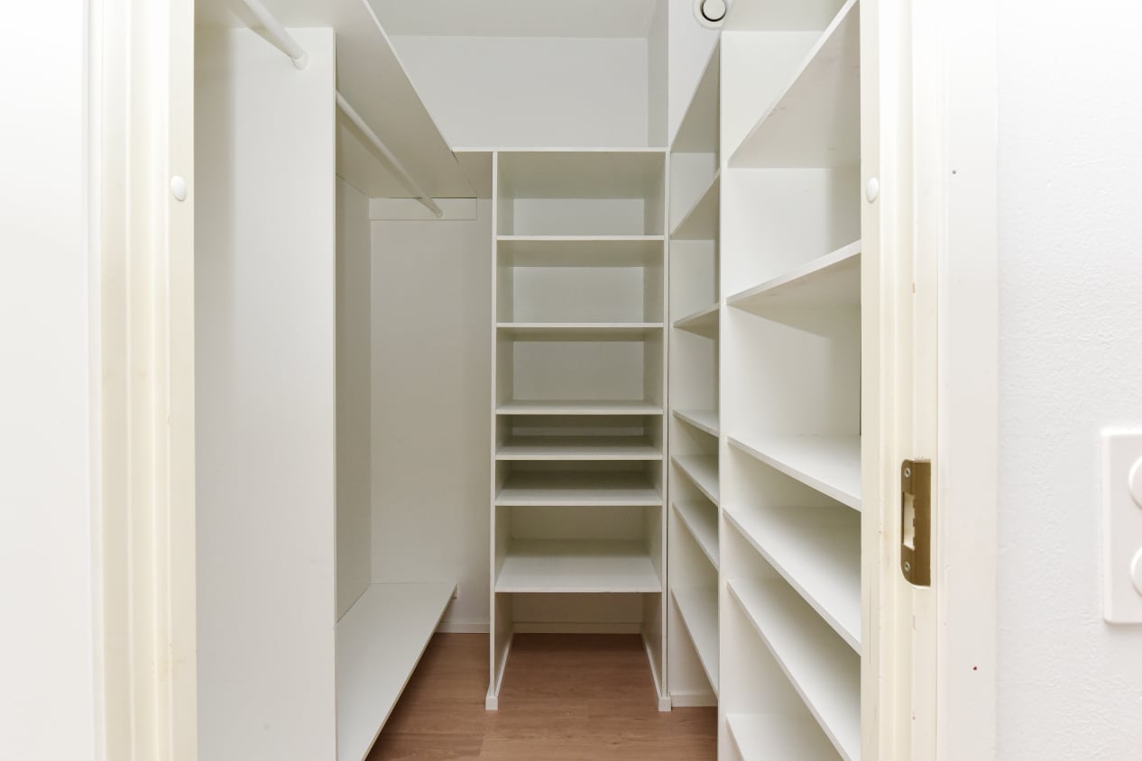 Keittiössä on astianpesukone, jääkaappi ja perinteinen liesi. Säilytystilaa on käytännöllisessä vaatehuoneessa.