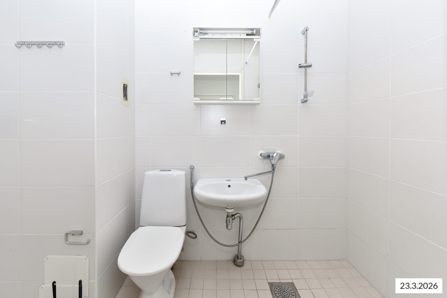 Asuinhuoneissa on laminaattilattiat ja kylppäri on kaakeloitu. Eteisessä mukavasti kaappitilaa, keittokomerossa jää-pakastinkaappi ja nelilevyinen sähköliesi. Kylpyhuoneessa on paikka pesukoneelle