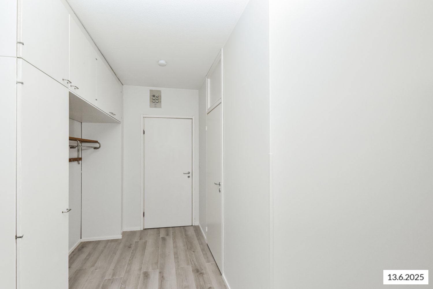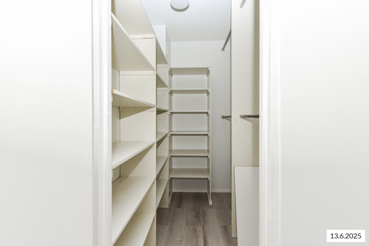 Säilytystilaa on eteisessä ja molemmissa makuuhuoneissa sekä olohuoneen yhteydessä sijaitsevassa vaatehuoneessa.