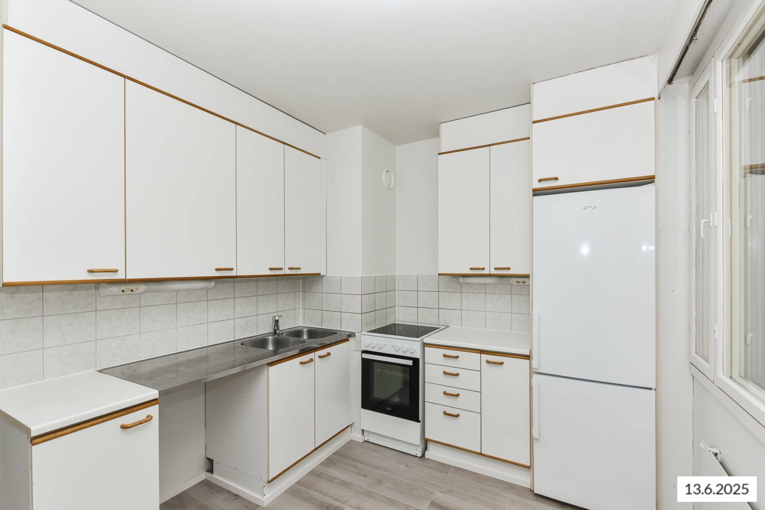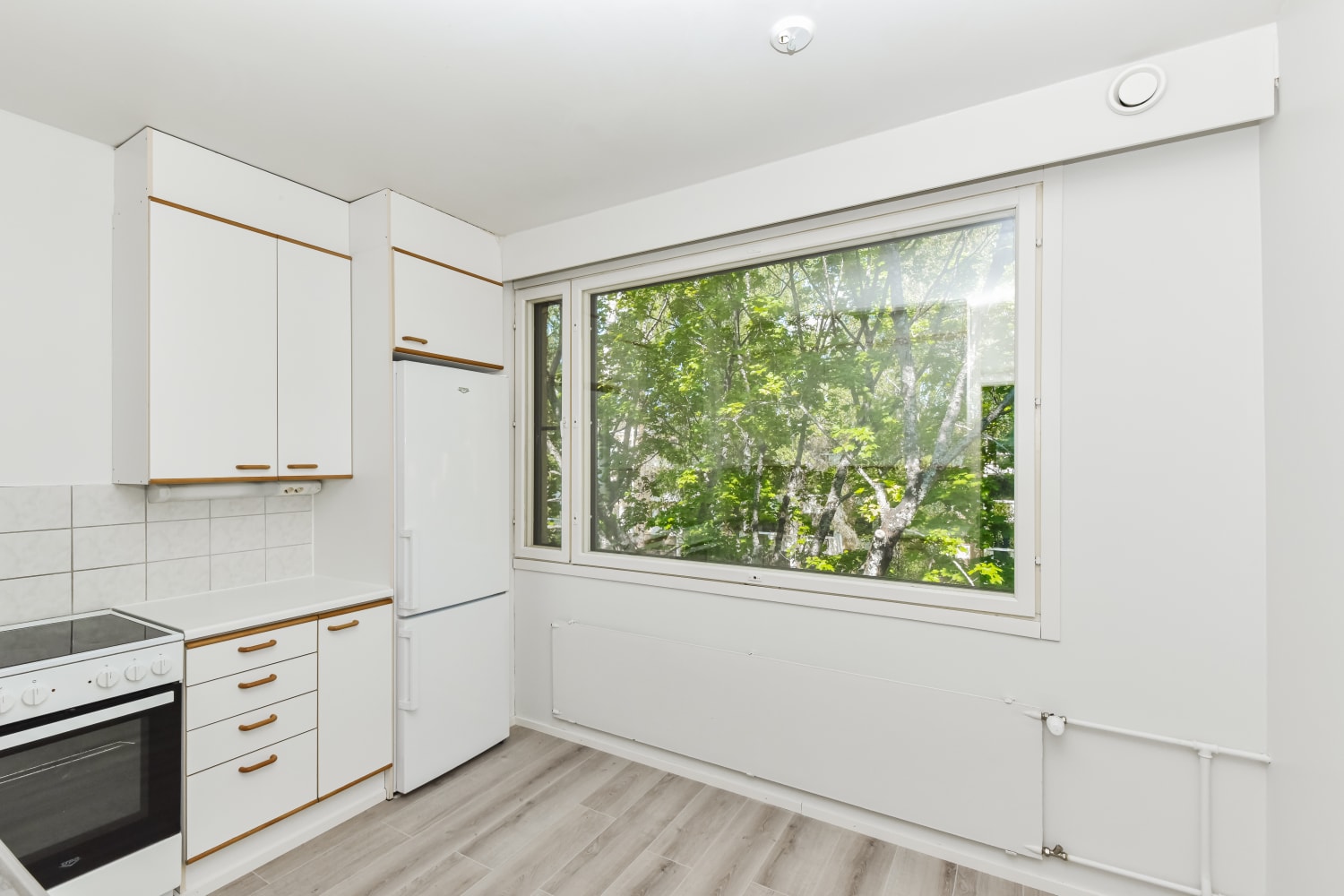 Läpitalon huoneistossa on erillinen keittiö, jonne mahtuu ruokapöytä ikkunan ääreen. Keittiöön mahtuu tarvittaessa myös astianpesukoneesi.