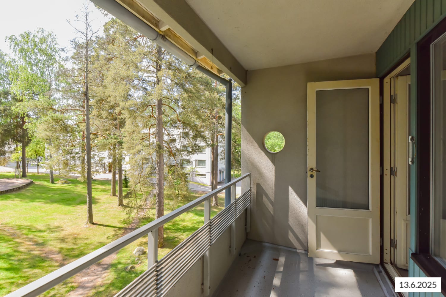 Tilavan kolmion pohjaratkaisu on perinteikkään toimiva: olohuoneesta pääset parvekkeelle, josta on avaran vehreät näkymät.