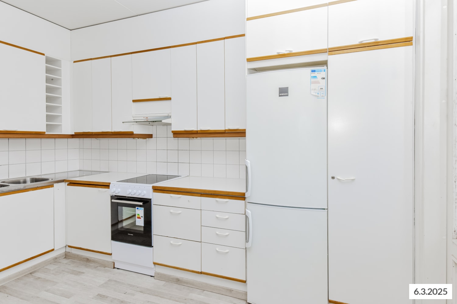 Keittiön varustukseen kuuluu jääkaappipakastin, lattiauuni ja perinteinen liesi. Keittiössä on myös tilavaraus astianpesukoneelle.