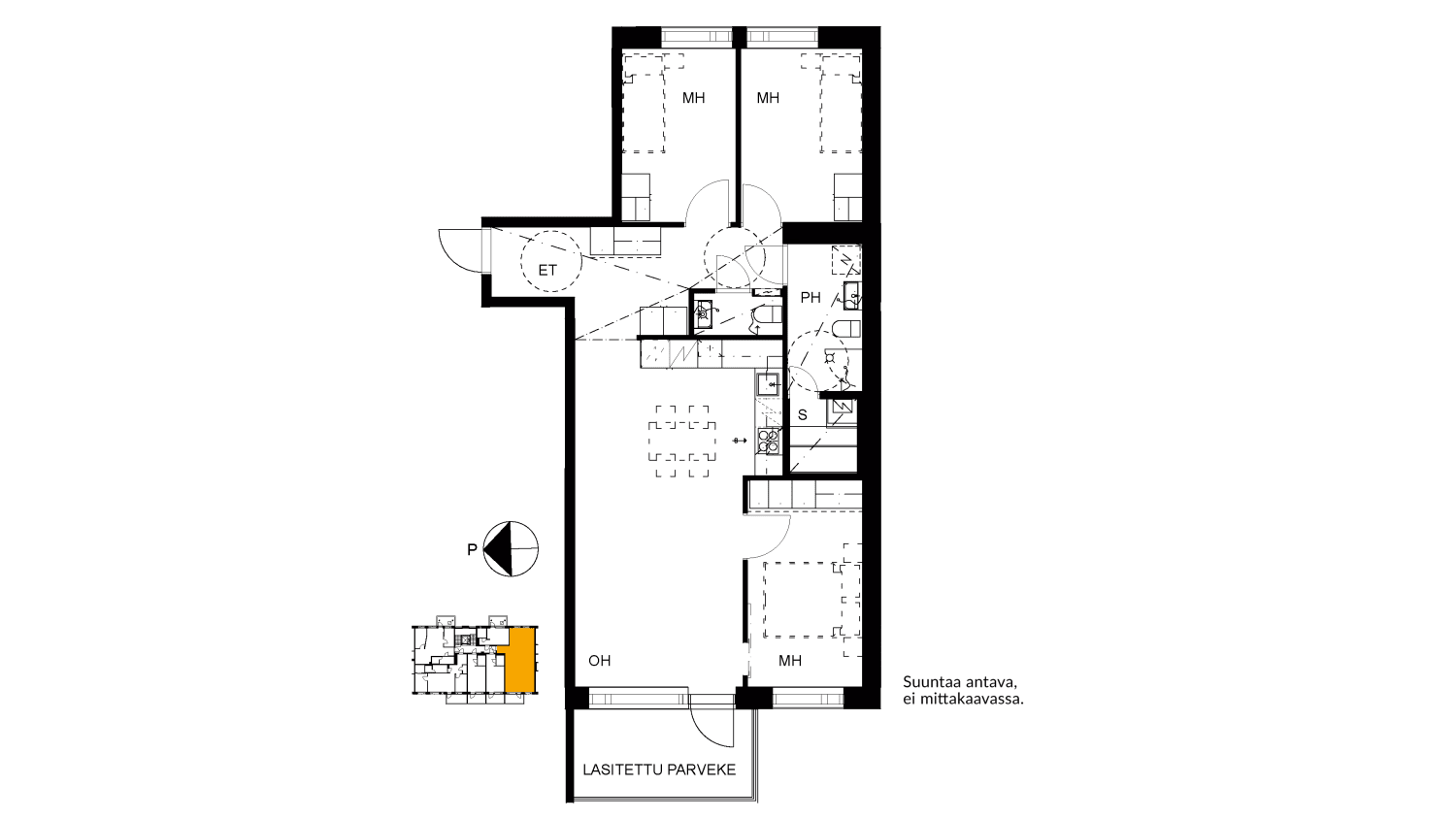 Aivan uuden, läpitalon asunnon selkeästi jäsennelty pohjaratkaisu antaa puitteet, joihin sinä voit rakentaa toiveidesi kodin. Olohuone ja keittiö ovat yhtenäistä avaraa tilaa, ja niiden jatkeena on reilunkokoinen, lasitettu parveke. Oma sauna ja tilava kylpyhuone tarjoavat parhaan rentoutumispaikan. Eteisessä on peiliovellinen kaapisto ja ikkunoissa on valmiina sälekaihtimet. Lattia on vaaleaa tammilaminaattia ja seinät on maalattu vaalean harmaalla. Keittiökaapistot ovat raikkaan valkoiset ja ylä- ja alakaappien välinen tila sekä työtaso ovat harmaata laminaattia. Varustukseen kuuluu astianpesukone, keraaminen liesi ja jääkaappipakastin. Kylpyhuoneessa on valkoiset SATOn Kide-malliston kalusteet. Seinät ovat valkoista laattaa ja lattia on harmaa. Pesukoneelle ja kuivausrummulle on paikka.
