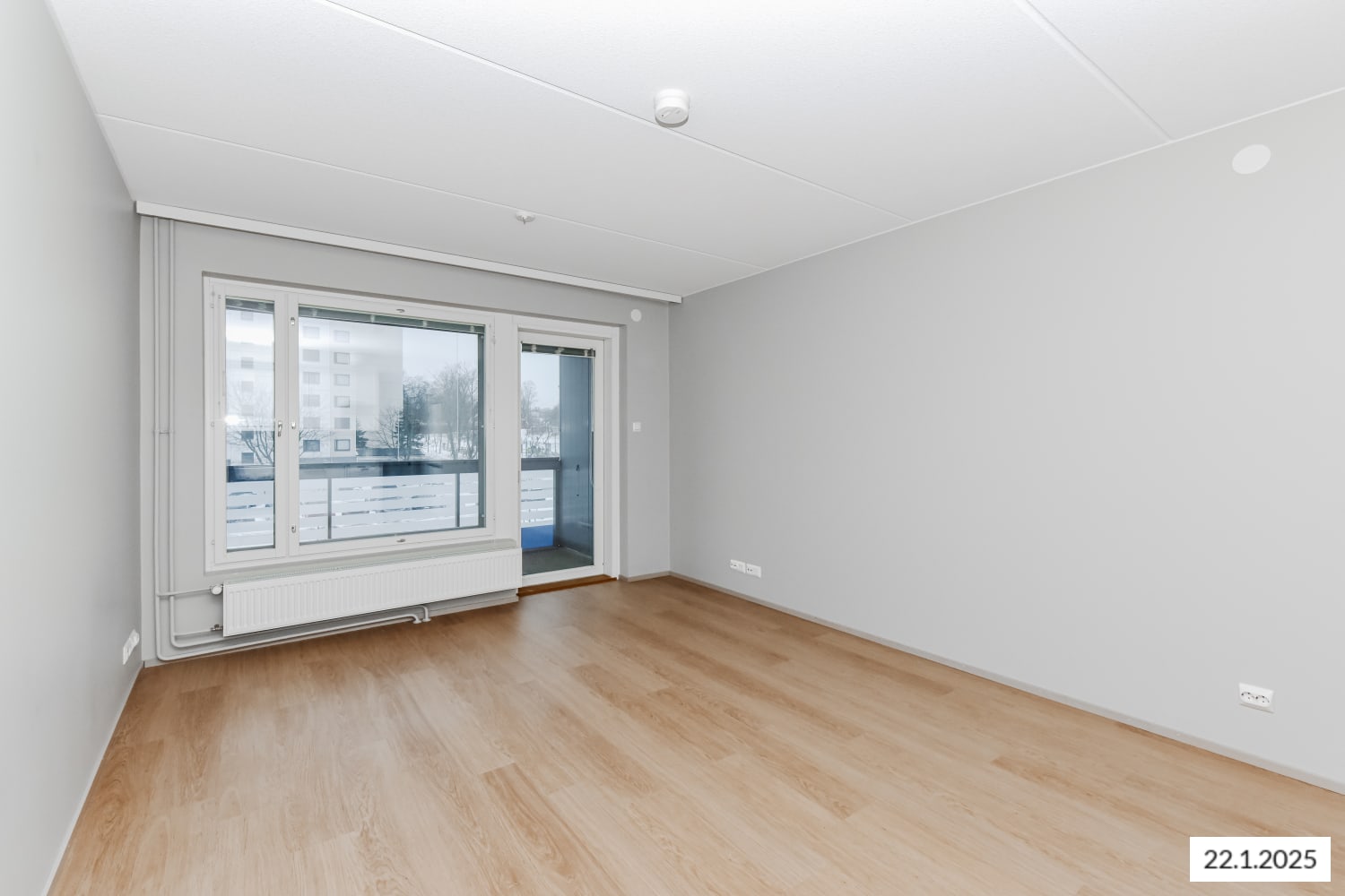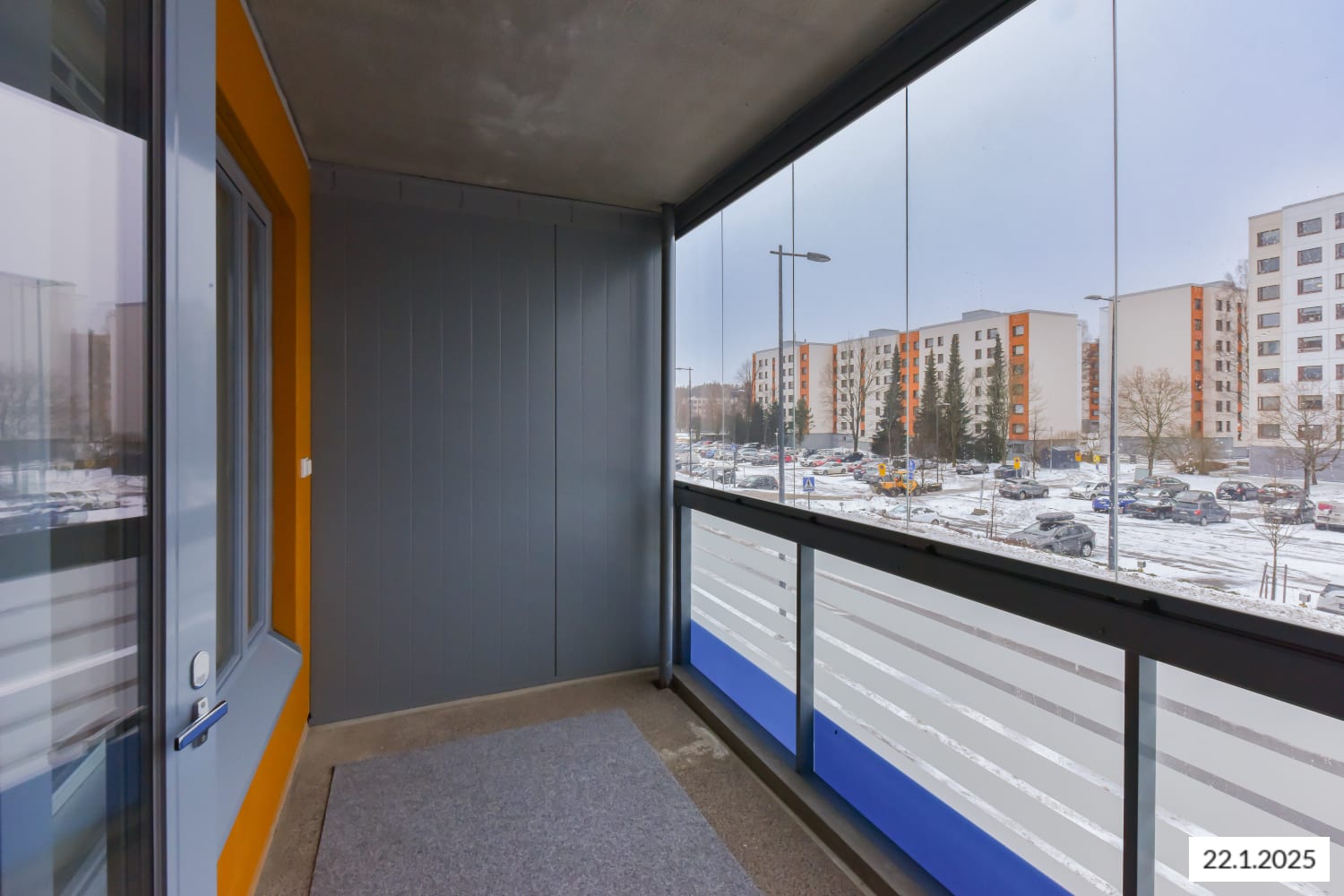 Raikkaan, neliöitään tilavamman tuntuisen yksiön kalustat helposti omaksi kodiksi. Keittiötilan yhteyteen sopii pieni ruokapöytä ja reilunkokoinen lasitettu parveke on ilta-auringon puolella. Eteisessä on peiliovellinen kaapisto ja ikkunassa on valmiina sälekaihtimet. Lattia on vaaleaa tammilaminaattia ja seinät on maalattu vaalean harmaalla. Keittiökaapistot ovat raikkaan valkoiset ja ylä- ja alakaappien välinen tila sekä työtaso ovat harmaata laminaattia.