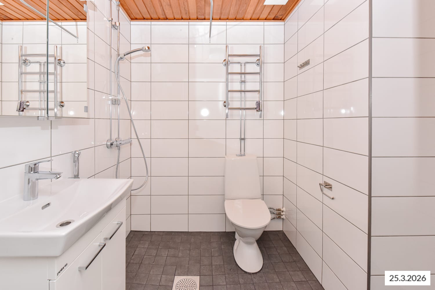 Kylpyhuoneessa on kosteiden tilojen muovimatto ja kaakeloidut seinät. Keittokomerossa on jää-pakastinkaappi ja nelilevyinen sähköliesi.