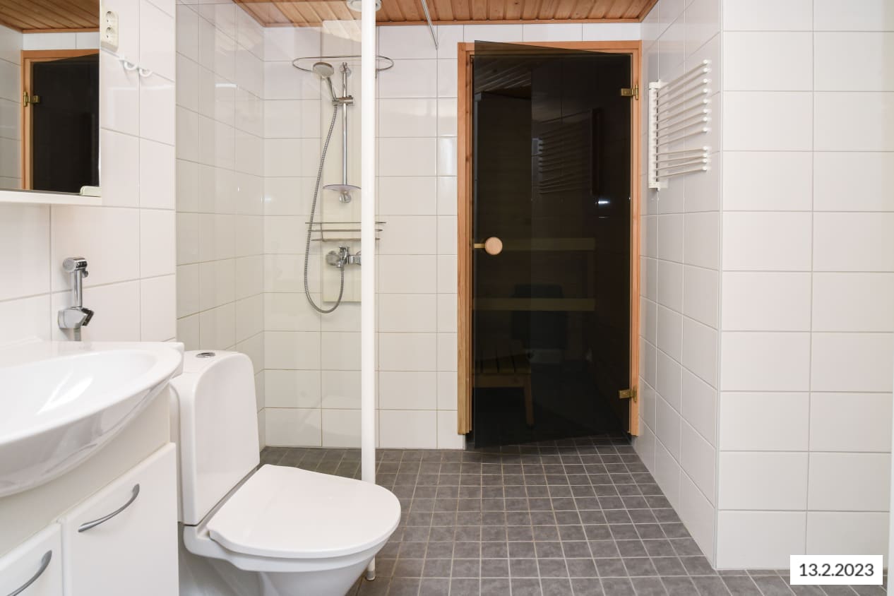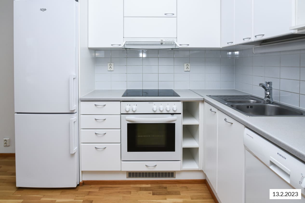 Asuinhuoneissa on tammiparketti- tai laminaattilattiat. Kylpyhuoneessa on mukavuuslattialämmitys, tyylikkään harmaa lattialaatoitus ja isot valkoiset seinäkaakelit. Keittiössä on graniittia mukaileva laminaattityötaso, valkoiset kaapistot sekä harmaat Kaakelikeskuksen kalustevälikaakeloinnit. Vakiovarusteina on jää-pakastinkaappi, astianpesukone ja keraaminen liesitaso kalusteuuneineen. Keittiökaapistossa on tilavaraus mikroaaltouunille.