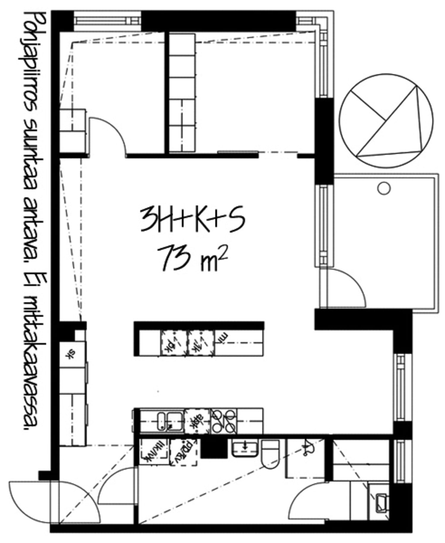 Hyväntuulisessa kulmahuoneistossa on kodikas keittiö, johon mahtuu kunnon ruokapöytä. Olohuone on kodin keskipisteenä ja makuuhuoneet mukavan rauhallisia. Pihan puolelle avautuvalla parvekkeella kelpaa viettää kesäiltoja ja oma sauna ilahduttaa etenkin talvisin.