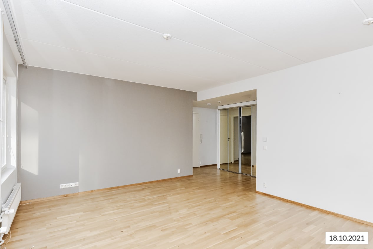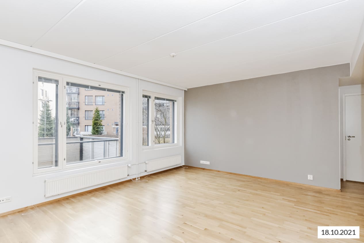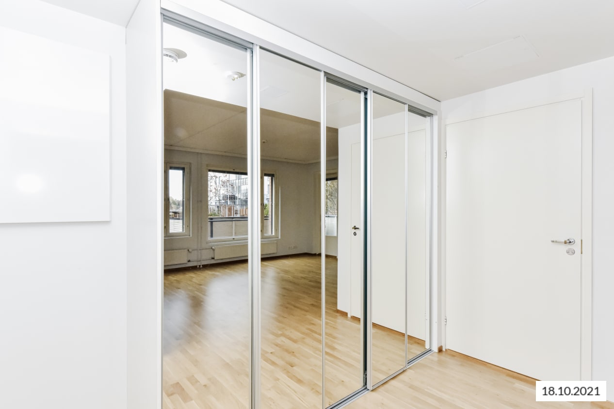 Ison kaksion keskipisteenä on tilava olohuone, jonka ikkunoista tulviva valo heijastuu muualle asuntoon eteisen isoista peilikaapeista. Parvekkeelta avautuu näkymä avaran korttelipihan puolelle aamuaurinkoon.