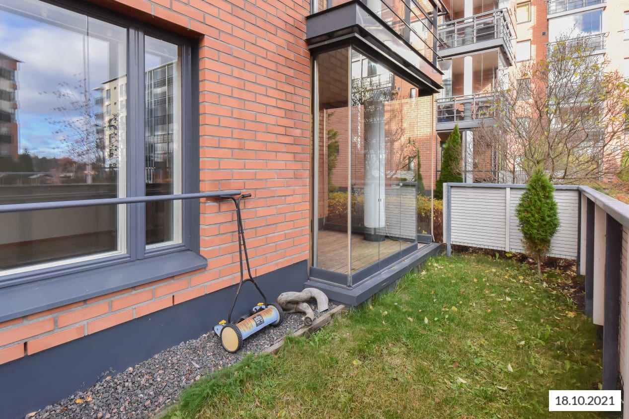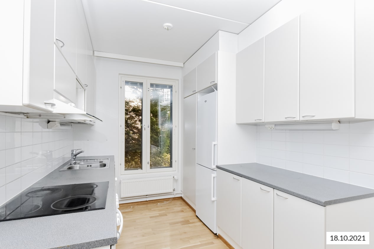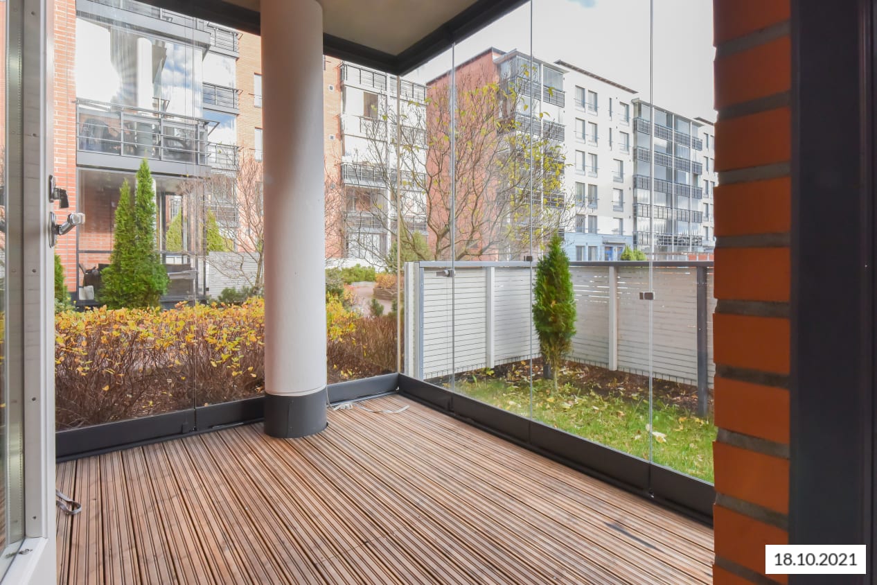 Ison kaksion keskipisteenä on tilava olohuone, jonka ikkunoista tulviva valo heijastuu muualle asuntoon eteisen isoista peilikaapeista. Parvekkeelta avautuu näkymä avaran korttelipihan puolelle aamuaurinkoon.
