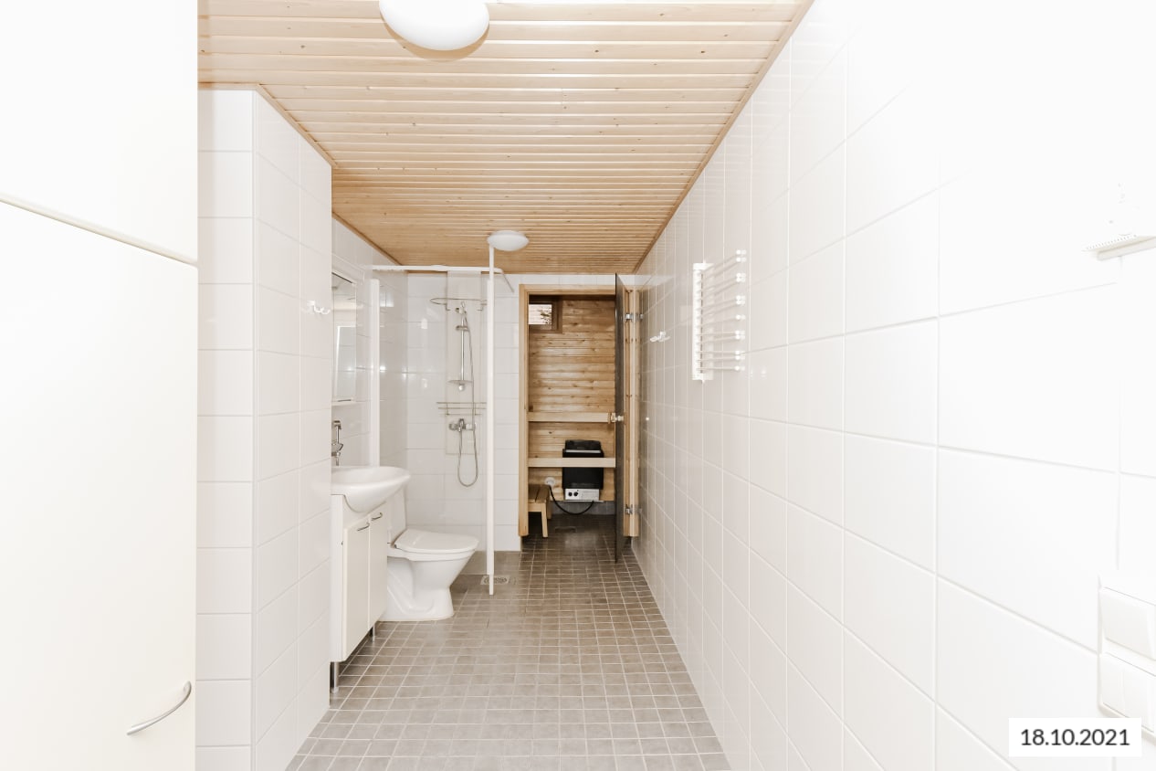 Asuinhuoneissa on tammiparketti- tai laminaattilattiat. Kylpyhuoneessa on lattialämmitys, isot valkoiset seinäkaakelit ja kaunis Kaakelikeskuksen keskiharmaa lattialaatoitus. Keittiön kaapistot ovat hillityn harmaat, pöytätaso tummanharmaata laminaattia ja kalustevälit vaakaan ladottua vaaleanharmaata kaakelia. Varusteina ovat astianpesukone, jää-pakastinkaappi ja tasoon upotettu keraaminen liesi uuneineen. Tähän kotiin on helppo ihastua!