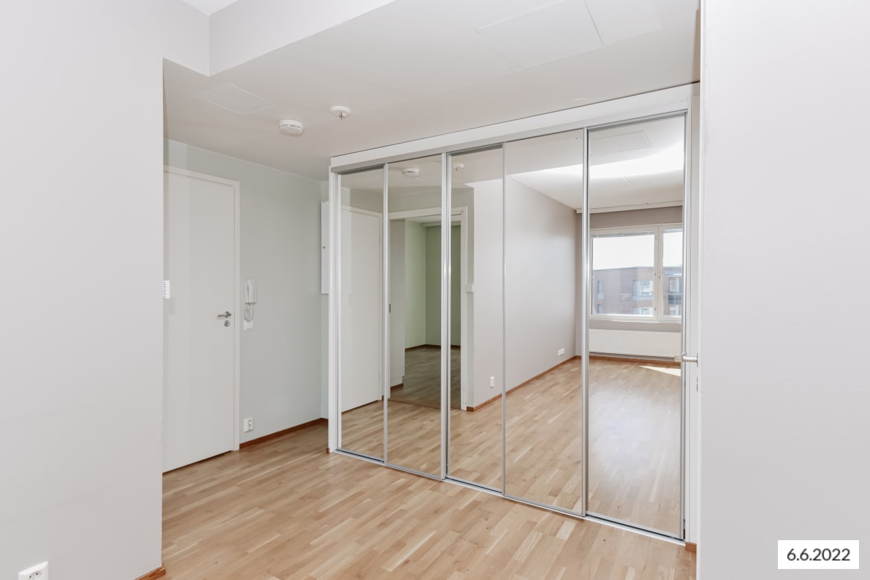 Kodikkaan kaksion keskipisteenä on tilava olohuone, jonka ikkunoista tulviva valo heijastuu muualle asuntoon eteisen isoista peilikaapeista. Parvekkeelta avautuu näkymä aamuaurinkoon yli avaran korttelipihan.
