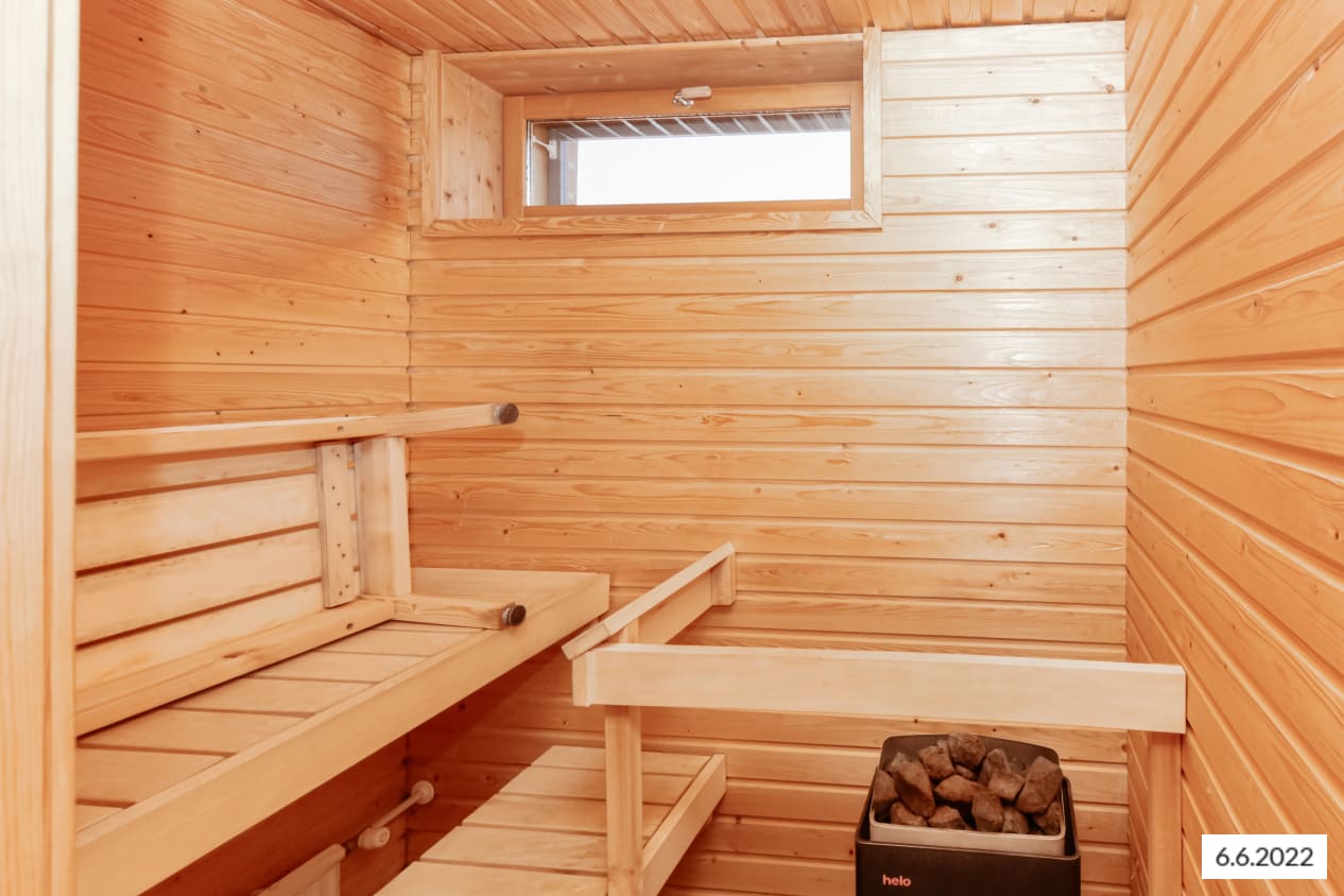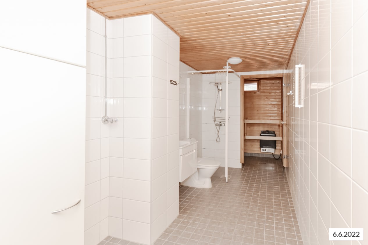 Asuinhuoneissa on tammiparketti- tai laminaattilattiat. Kylpyhuoneessa on lattialämmitys, isot valkoiset seinäkaakelit ja kaunis Kaakelikeskuksen keskiharmaa lattialaatoitus. Keittiön kaapistot ovat hillityn harmaat, pöytätaso tummanharmaata laminaattia ja kalustevälit vaakaan ladottua vaaleanharmaata kaakelia. Varusteina ovat astianpesukone, jää-pakastinkaappi ja tasoon upotettu keraaminen liesi uuneineen.