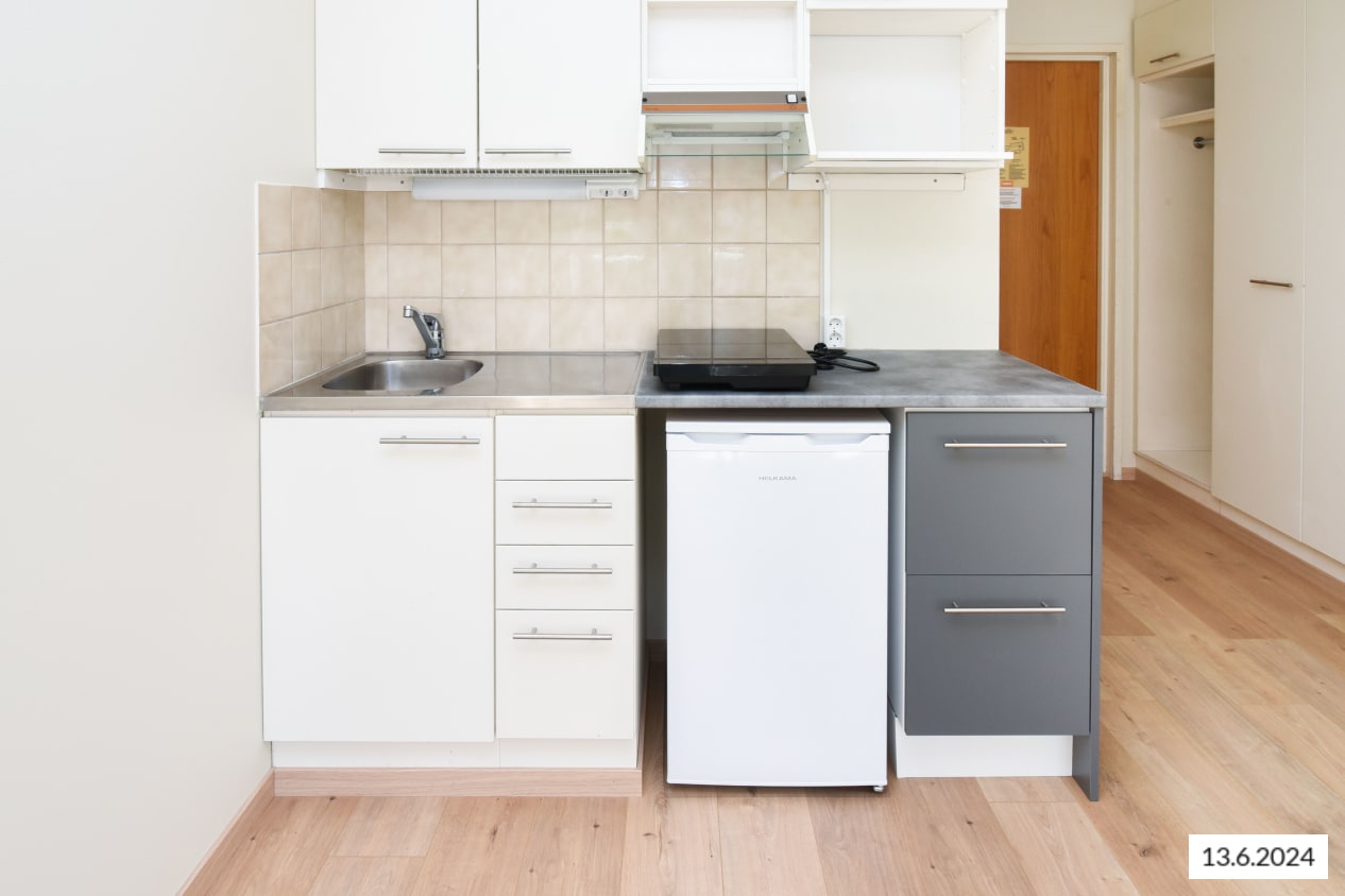 Talon palovaroittimet laukaisevat herkästi hälytyksen ruoan valmistuksen yhteydessä. Suosittelemme siksi käyttämään talon pohjakerroksessa sijaitsevaa yhteiskeittiötä ruoan valmistamiseen. Jääkaappi on pakastelokeroton. Keittiön taso on helppohoitoista laminaattia.