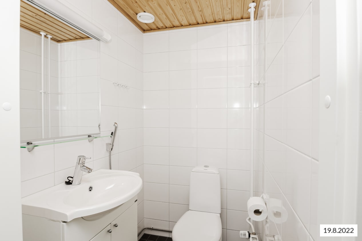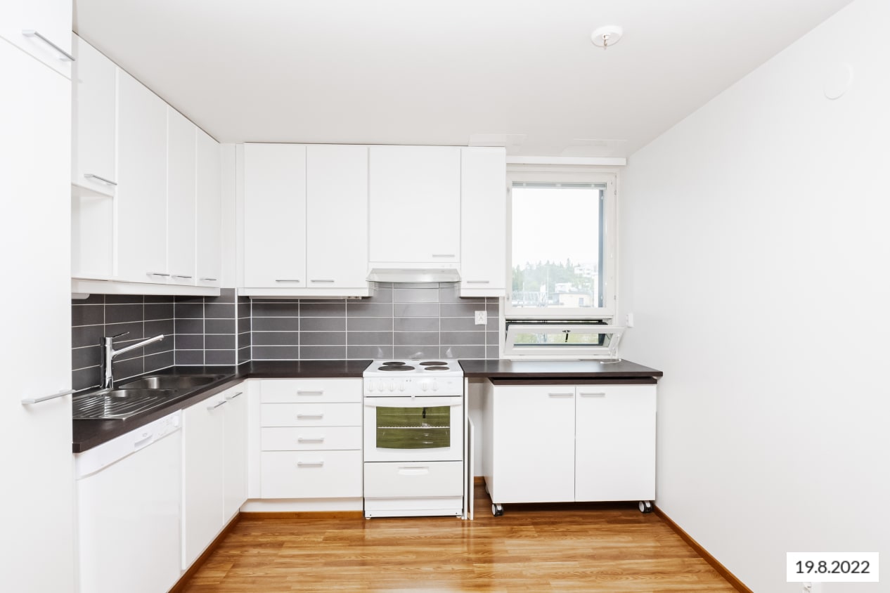 Asuinhuoneiden lattiamateriaalina on helppohoitoinen tammilaminaatti. Ikkunallisessa kylpyhuoneessa on valkoiset seinäkaakelit, tummanharmaa laattalattia ja lattialämmitys. Avoimen keittiön työtasot ovat wengepuuta mukailevaa laminaattia ja kalusteväleissä on kauniin vaaleanharmaa kaakelointi. Keittiössä on jää-pakastinkaappi ja nelilevyinen sähköliesi. Asunnon ilmanvaihtoa voidaan tehostaa asunnossa sijaitsevasta tehostuskytkimestä.