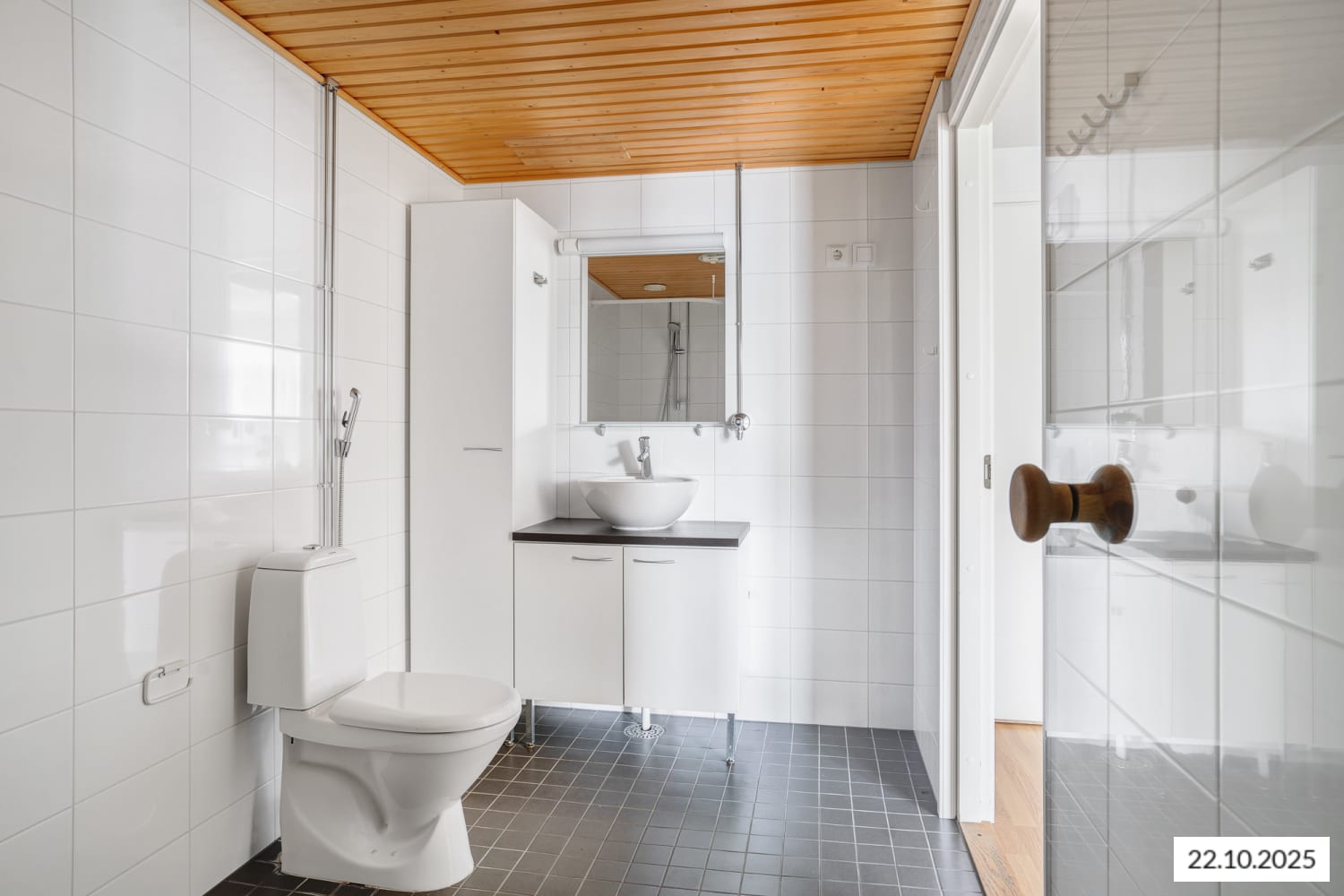 Asuinhuoneiden lattiamateriaalina on helppohoitoinen tammilaminaatti. Selkeälinjaisessa kylpyhuoneessa on valkoiset seinäkaakelit, tummanharmaa laattalattia ja mukavuuslattialämmitys.