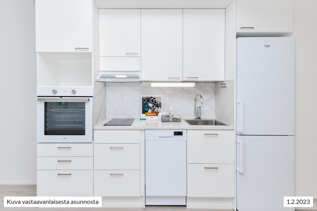 Valoisassa kodissa on toimiva pohja, joka antaa useita mahdollisuuksia kalustaa tila juuri sinulle sopivaksi. Täysin uuden asunnon jatkeena toimii tilava, lasitettu parveke. Kompaktissa yksiössä on näppärä avokeittiö ja kaappitilaa eteisessä. Kodin pintamateriaalit ovat ajattoman kauniita ja vaaleat sävyt toimivat neutraalina pohjana mille tahansa sisustustyylille. Avokeittiössä on raikkaan valkoiset kaapinovet ja marmorikuosiset laminaattitasot. Keittiön varustukseen kuuluu keraaminen liesitaso, kalusteuuni, astianpesukone ja kylmälaitteet sekä varaus mikroaaltouunille. Kylpyhuoneen kalusteet ovat ovat SATOlle suunniteltua, kotimaista Kide-mallistoa ja väriltään valkoiset. Kylpyhuoneen seinät ovat valkoista laattaa ja lattian laatoitus on tumman harmaa. Kylpyhuoneessa on myös varaus pesukoneelle ja kuivausrummulle.