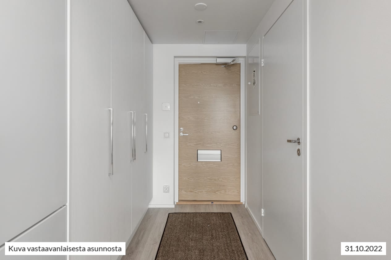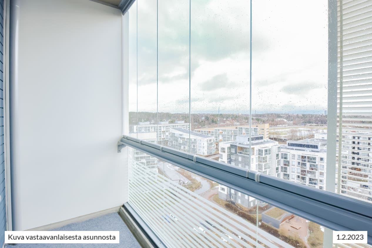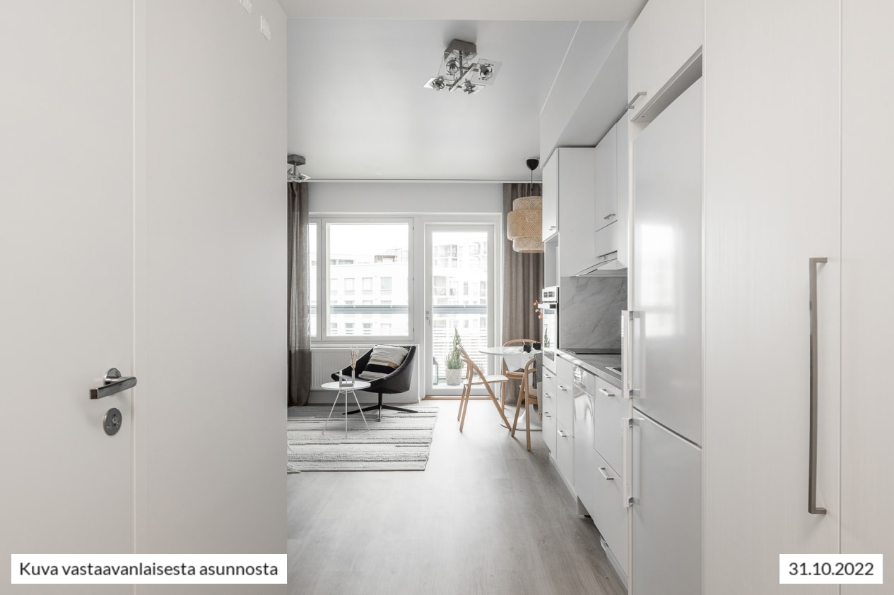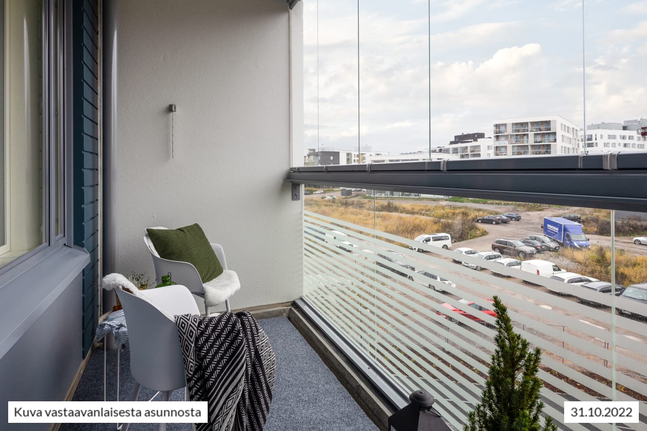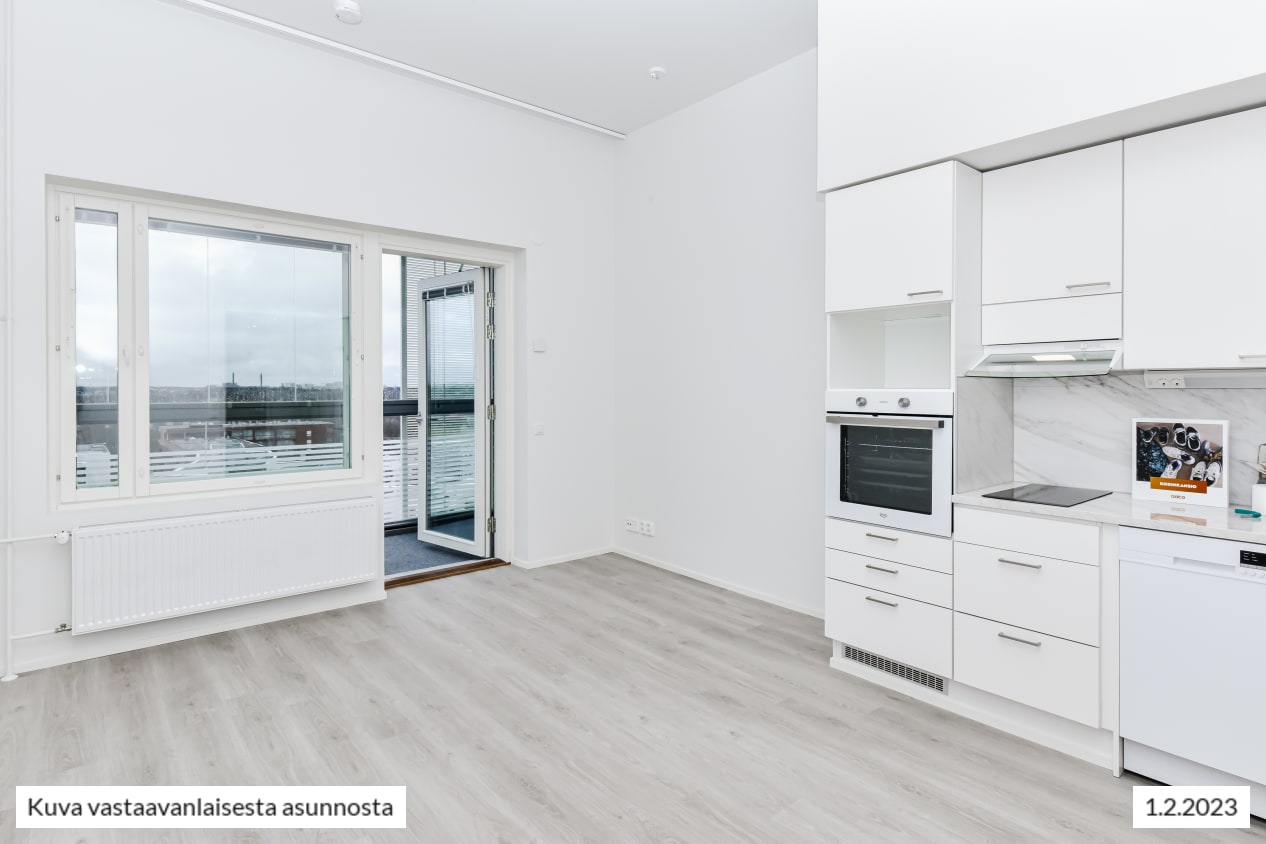 Valoisassa kodissa on toimiva pohja, joka antaa useita mahdollisuuksia kalustaa tila juuri sinulle sopivaksi. Täysin uuden asunnon jatkeena toimii koko tilan levyinen, lasitettu parveke, josta on näkymät kohti merta Helsingin ja Vermon raviradan suuntaan. Tässä kodissa jokainen neliö on hyötykäytössä. Kompaktissa yksiössä on näppärä avokeittiö ja kaappitilaa eteisessä. Kodin pintamateriaalit ovat ajattoman kauniita ja vaaleat sävyt toimivat neutraalina pohjana mille tahansa sisustustyylille. Avokeittiössä on raikkaan valkoiset kaapinovet ja marmorikuosiset laminaattitasot. Keittiön varustukseen kuuluu keraaminen liesitaso, kalusteuuni, astianpesukone ja kylmälaitteet sekä varaus mikroaaltouunille. Kylpyhuoneen kalusteet ovat ovat SATOlle suunniteltua, kotimaista Kide-mallistoa ja väriltään valkoiset. Kylpyhuoneen seinät ovat valkoista laattaa ja lattian laatoitus on tumman harmaa. Kylpyhuoneessa on myös varaus pesukoneelle ja kuivausrummulle.