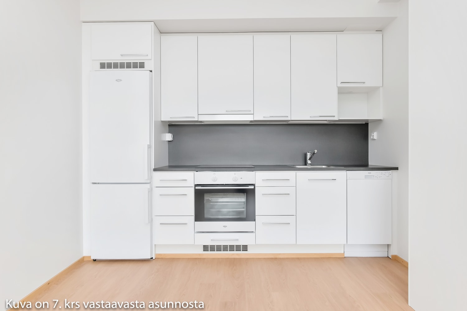 Korkealle kohoavan vaaleasävyisen yksiön pohjaratkaisu on selkeä ja avoin. Keittiö ja olohuone yhdistyvät viihtyisäksi oleskelualueeksi, joka on helppo kalustaa kodikkaasti.