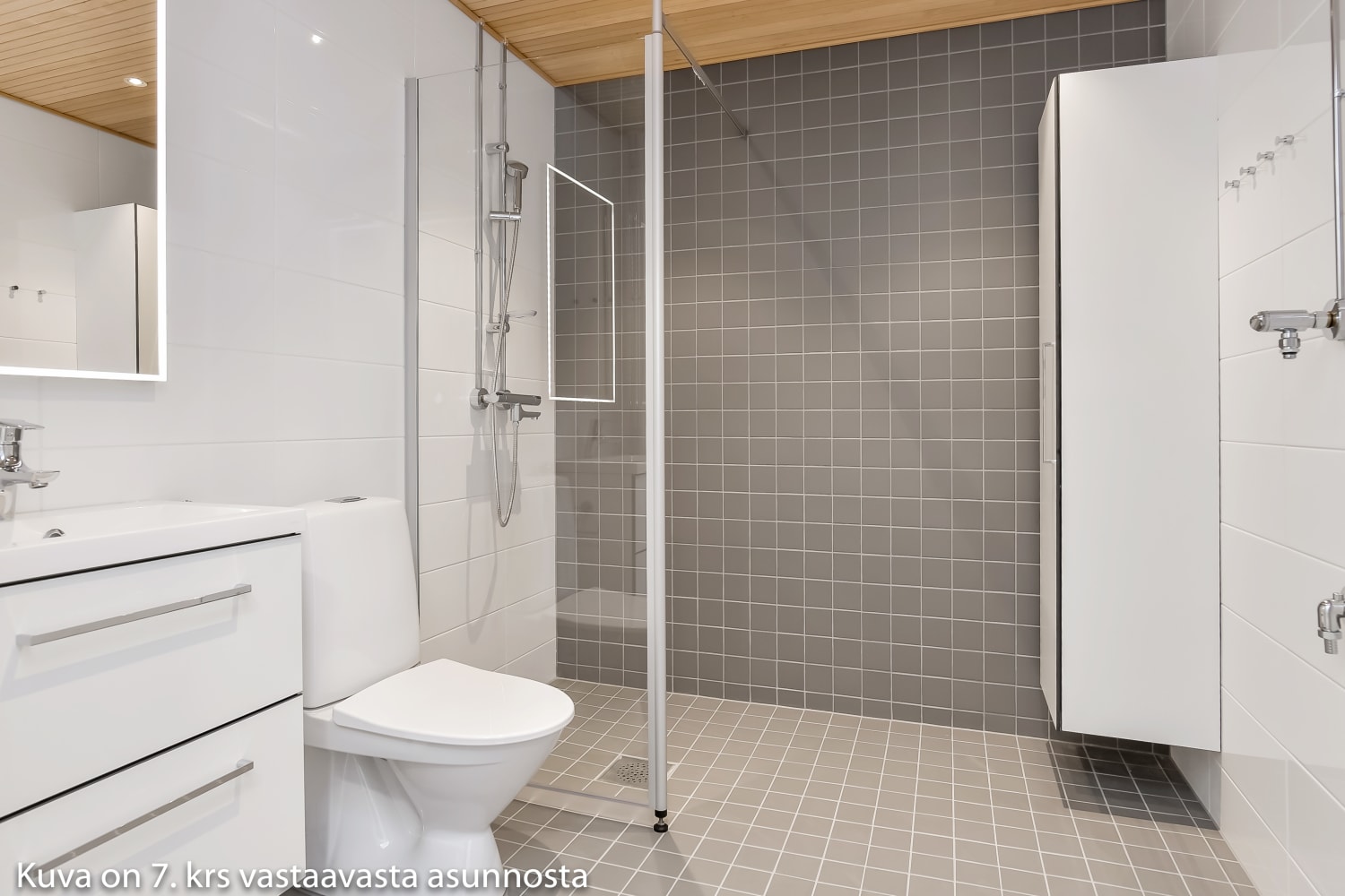 Kylpyhuoneessa seinät ovat kiiltävän valkoista laattaa. Lattiat ja tehosteseinät ovat harmaata laattaa. Kylpyhuoneen kalusteet ovat kotimaista Kide-mallistoa. Pesukoneelle ja kuivausrummulle on varaus.