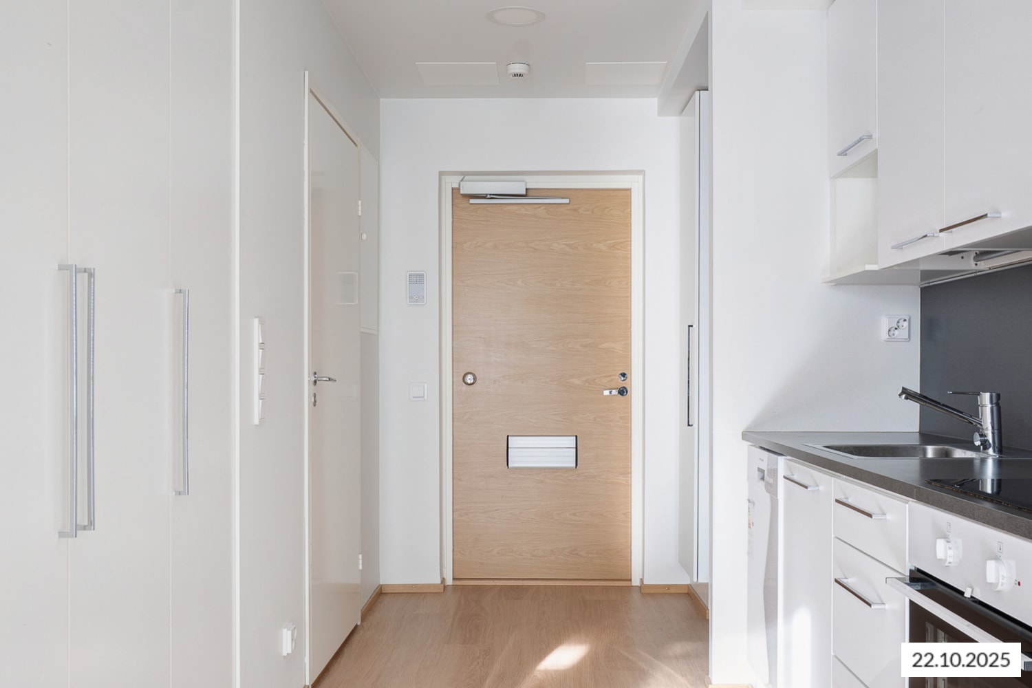 Asuintiloissa lattiat ovat valkaistua tammilankkua mukailevaa laminaattia. Keittiön ja kylpyhuoneen kalusteet ja komerot ovat kotimaista Kankarin kalusteen tuotantoa. Eteisen metallinen design-naulakko on SATOn oma malli. Keittiökaapistojen ovet ovat raikkaan valkoiset. Työtaso ja ylä- ja alakaappien välinen tila ovat harmaata laminaattia. Varustuksena on keraaminen liesitaso, kalusteuuni, astianpesukone ja kylmälaitteet sekä varaus mikroaaltouunille.