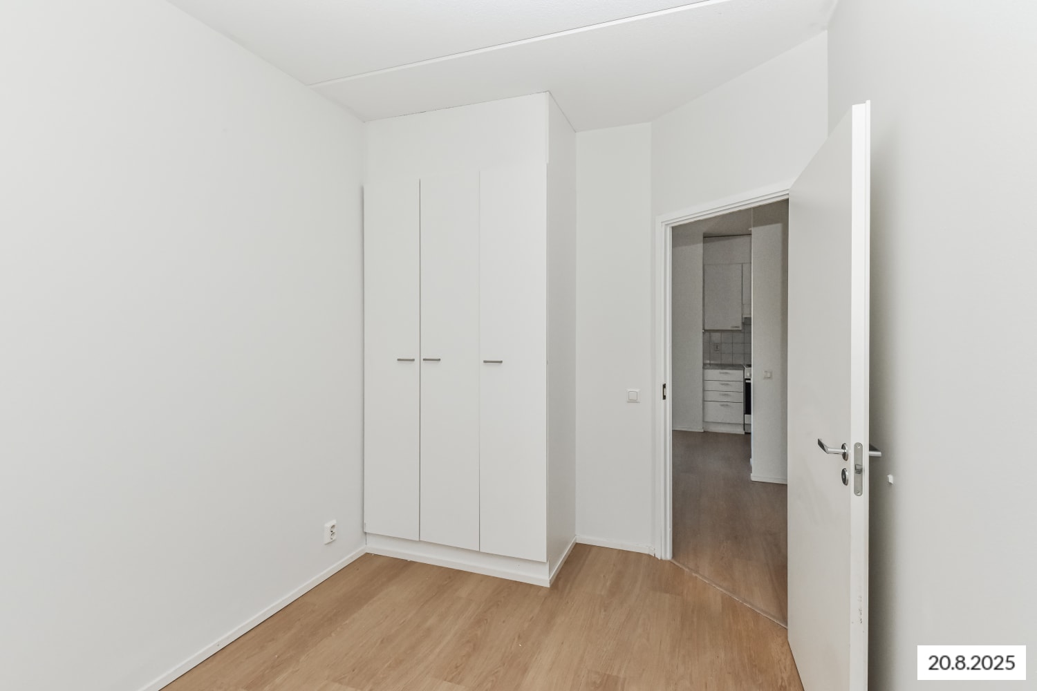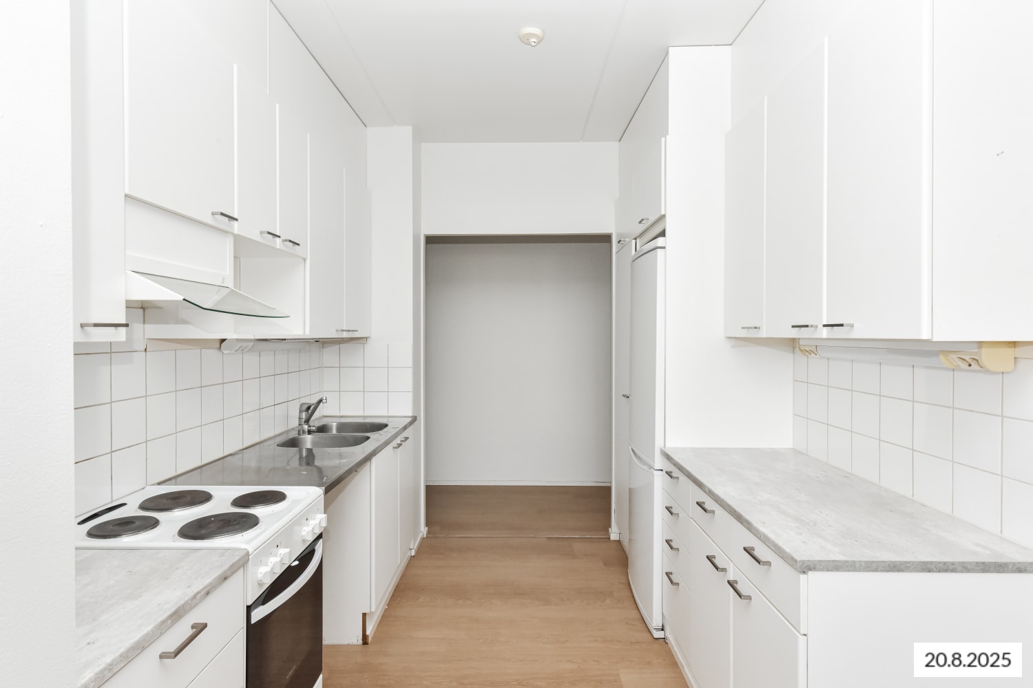 Asuinhuoneiden lattiamateriaalina on laminaatti ja seinät on maalattu valkoisiksi. Keittiöön mahtuu ruokapöytä ikkunan ääreen. Keittiön kaapistot ovat valkoiset ja kaapistojen välitila on laatoitettu valkoisilla laatoilla. Varustukseen kuuluu liesi, liesikupu ja jääkaappipakastin, tilavaraus löytyy astianpesukoneelle ja mikroaaltouunille.