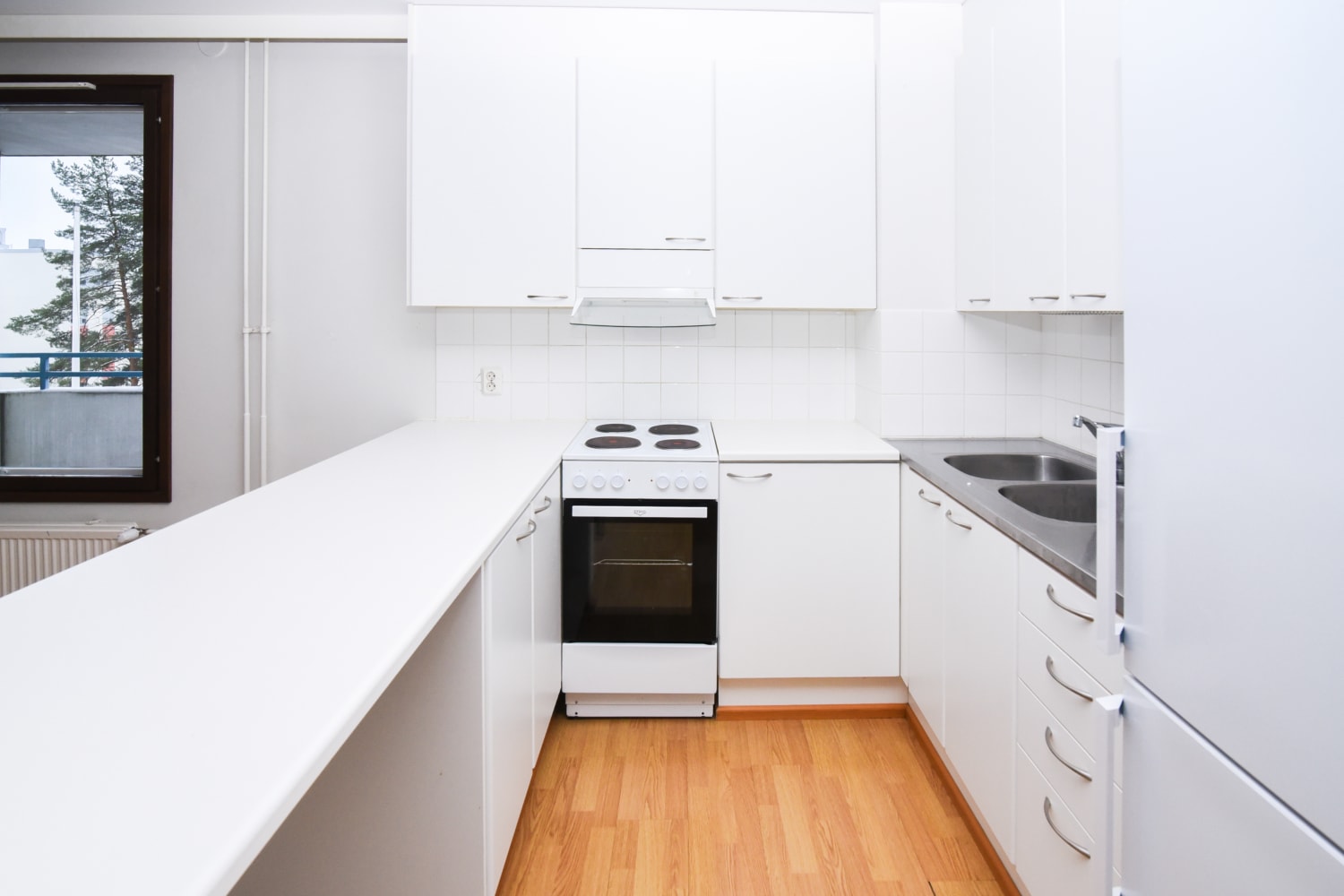 Keittiössä on vaaleat kaapistot, valkoinen työtaso, jääkaappipakastin ja liesi. Astianpesukoneelle on liitäntä. Kylpyhuoneessa on tilaa pyykinpesukoneelle.