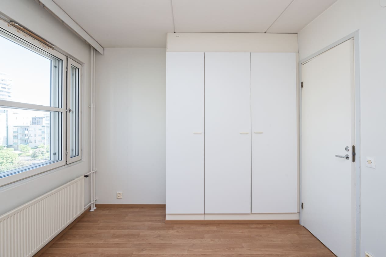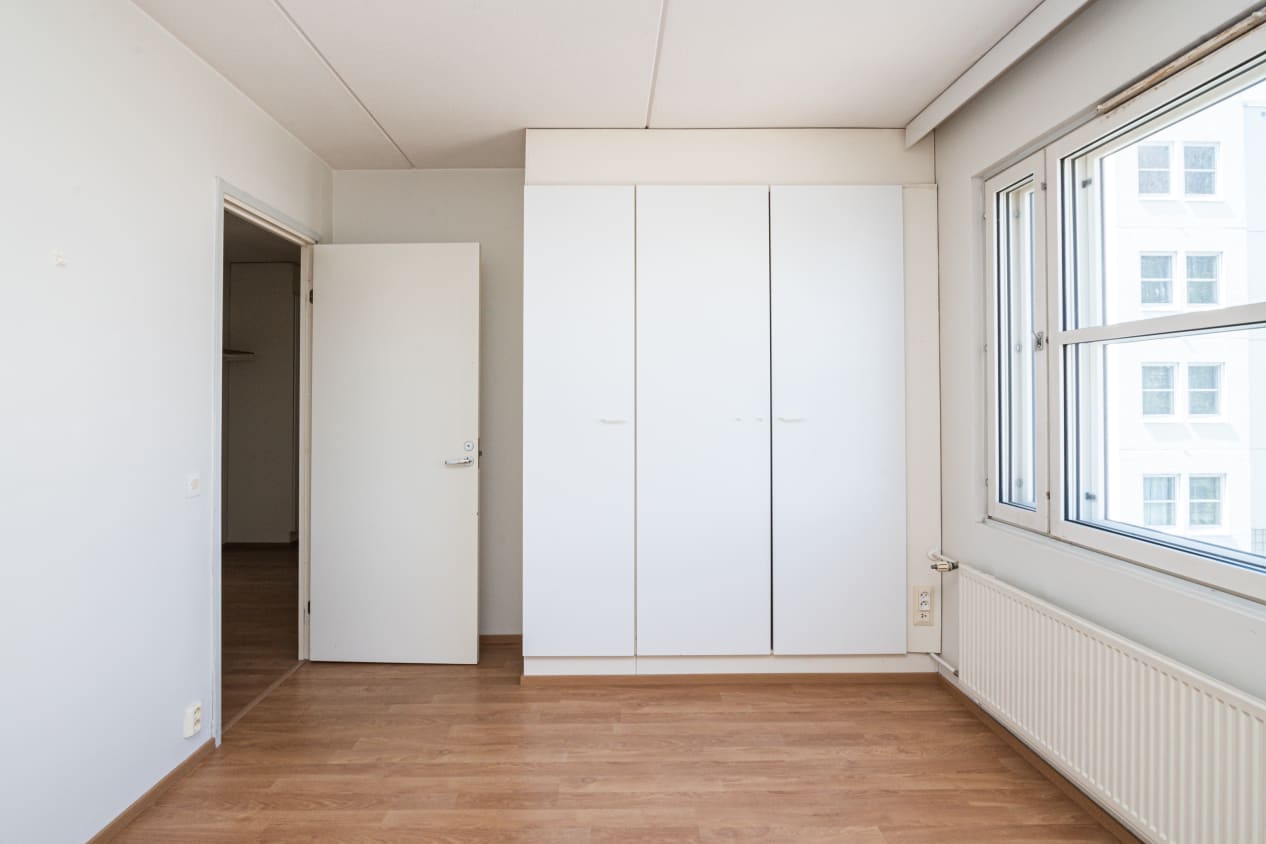 Makuuhuoneessa on valmiina runsaasti säilytystilaa korkeissa valkoisissa kaapeissa, ja huoneen rauhallinen tunnelma kutsuu lepäämään pitkän päivän päätteeksi. Kodin seinät ovat maalattu raikkaan valkoisiksi, mikä luo tilan tuntua ja tuo esiin laminaattilattian kauniin sävyn.