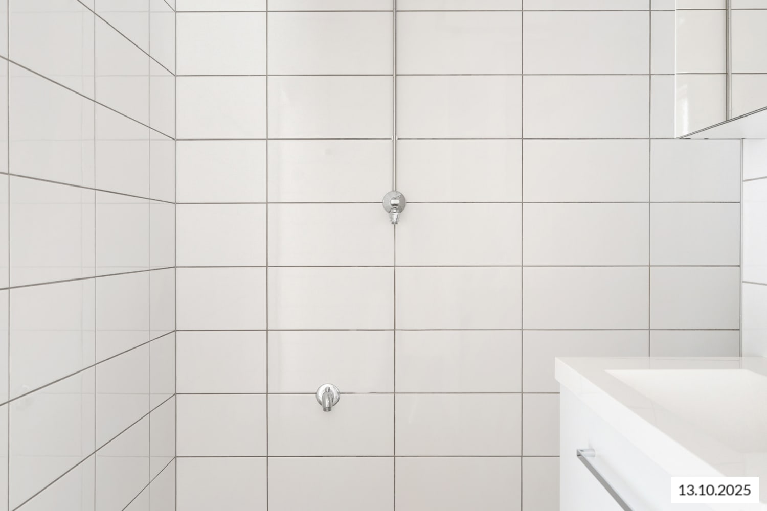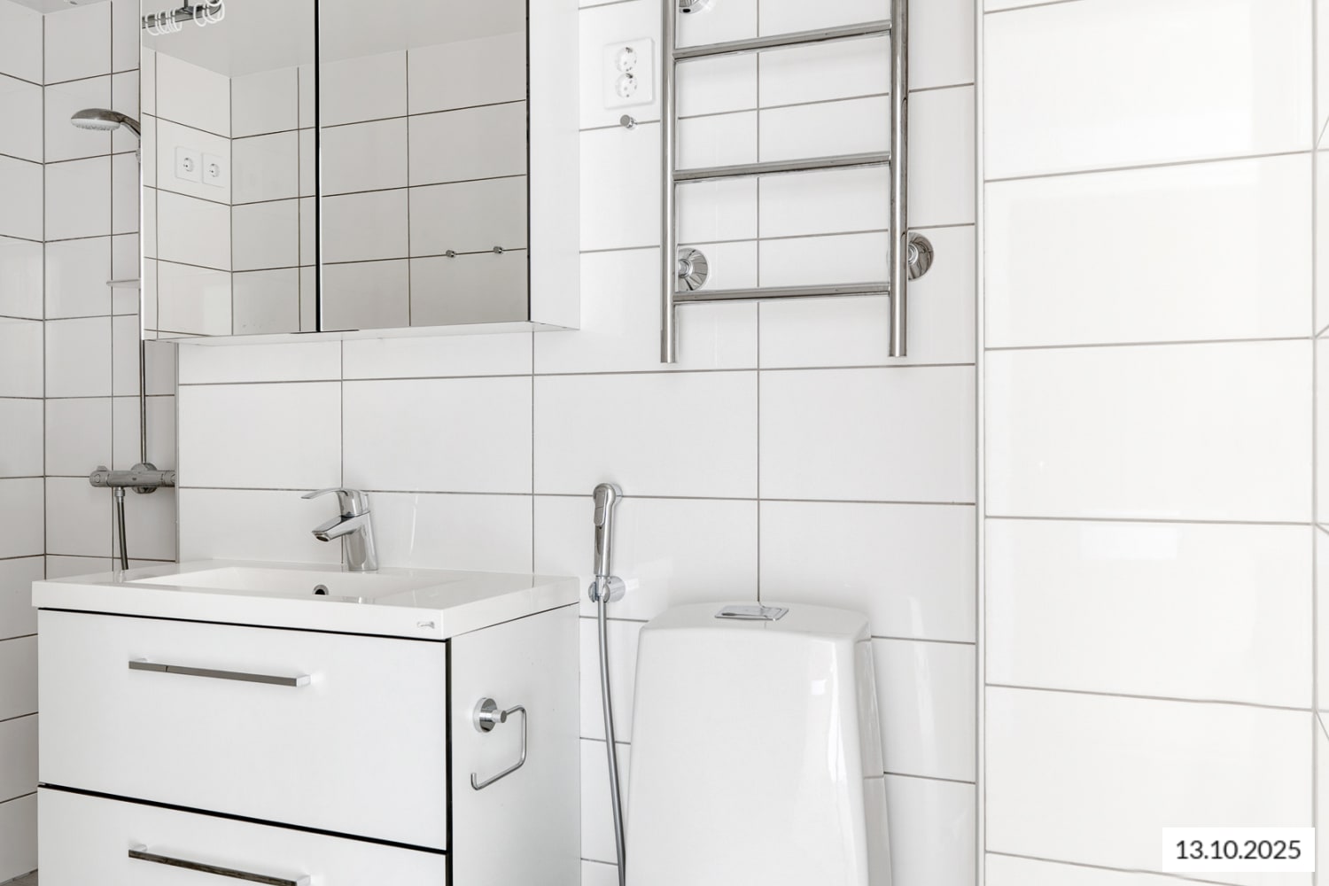 Kylpyhuoneessa on valkoiset kotimaiset Kide-malliston kalusteet. Seinät ovat valkoista laattaa ja lattia on harmaa. Kapealle pyykinpesukoneelle löytyy oma paikka (oven kulkuaukko n. 57 cm).