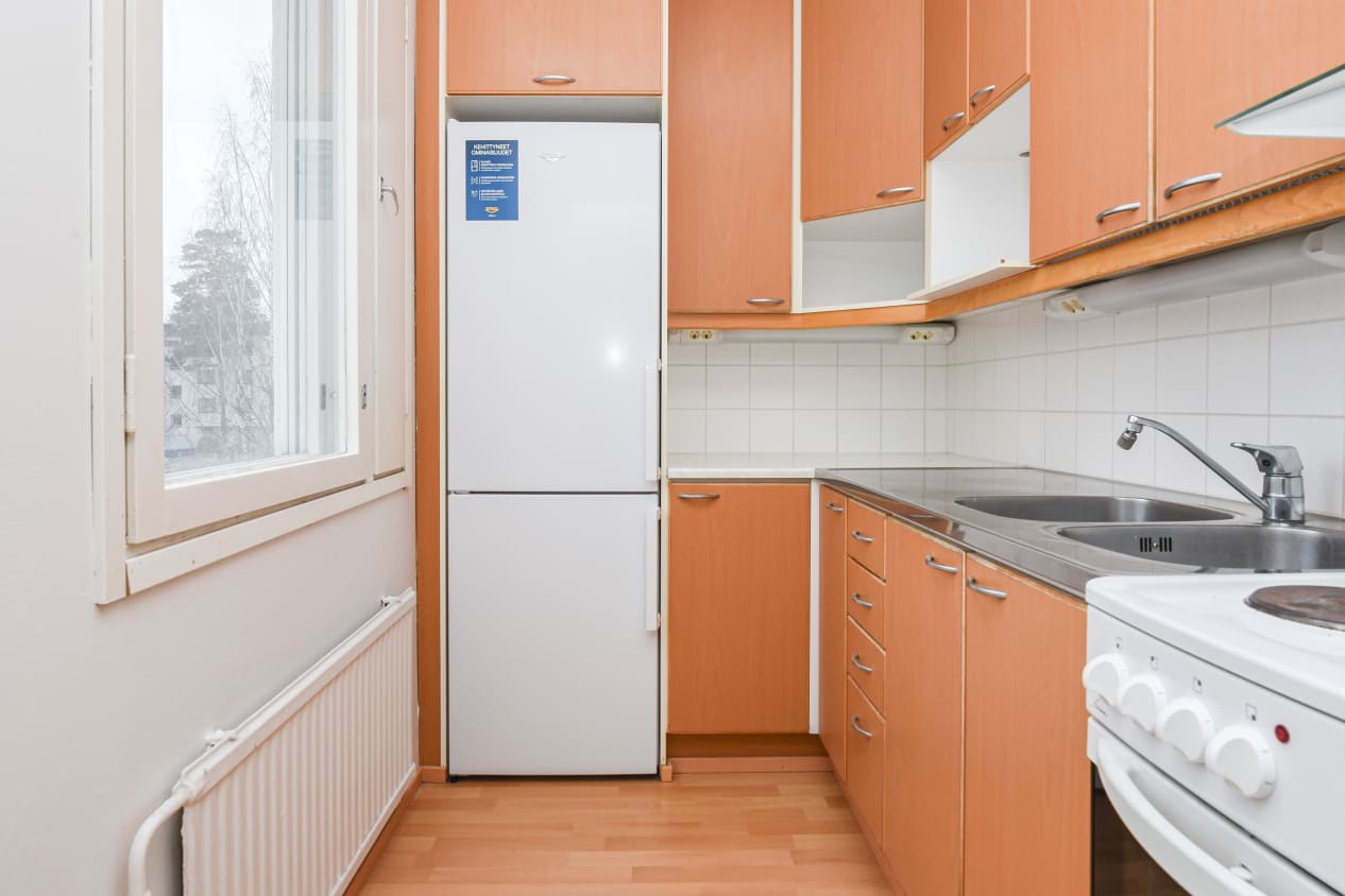Keittiön kaapistot ovat 70-luvun henkeen punertavan puun sävyiset, luoden uniikin tunnelman keittiönurkkaukseen. Varustukseen kuuluu jääkaappi, pakastin, lattiauuni ja liesi. Kaapistojen välikössä on tilavaraus mikroaaltouunille.