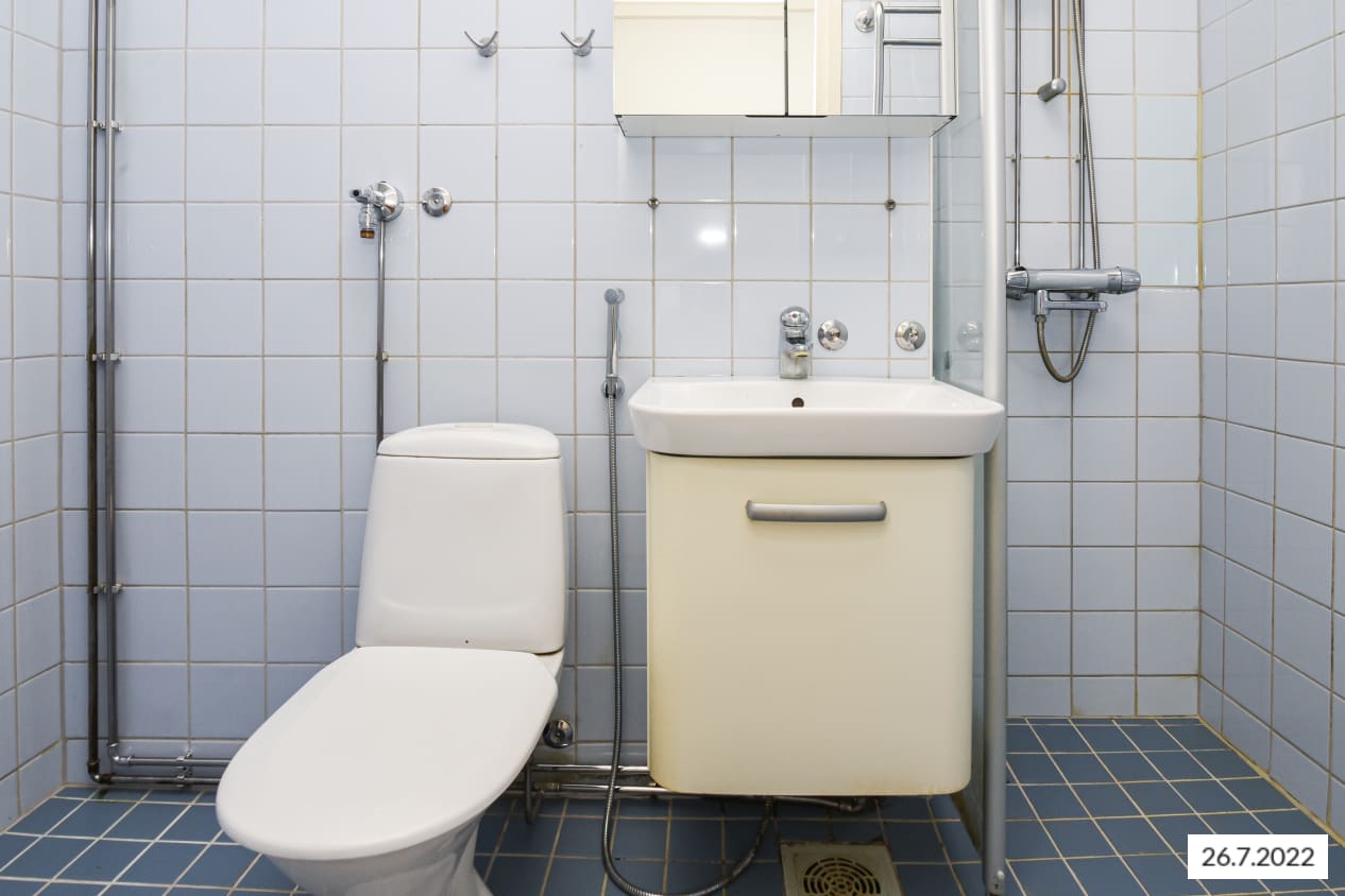 Laatoitetussa kylpyhuoneessa on liitäntä pyykinpesukoneelle.