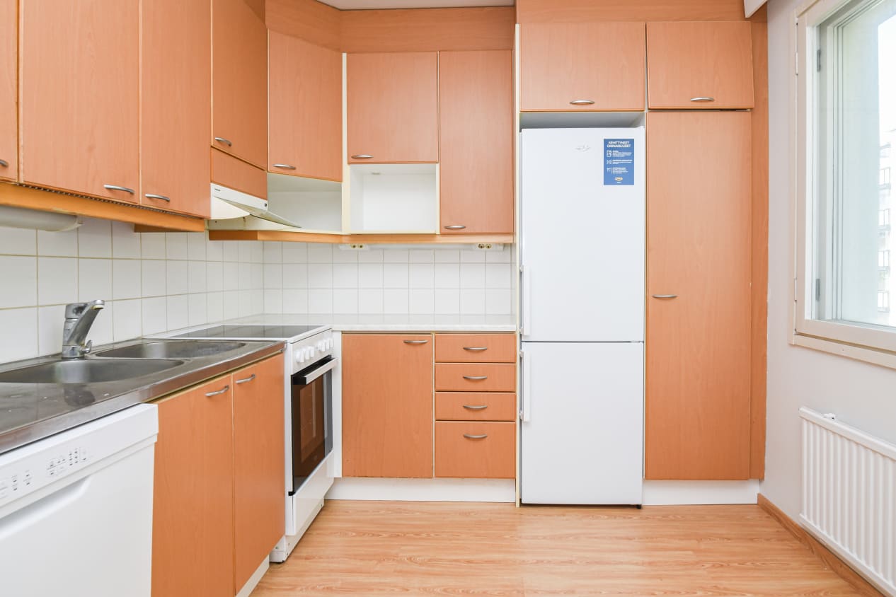 Keittiön ikkunan ääressä on paikka pienelle ruokapöydälle, ja astianpesukone helpottaa arjen askareita. Keittiön varusteisiin kuuluvat myös perinteinen liesi ja jääkaappi.
