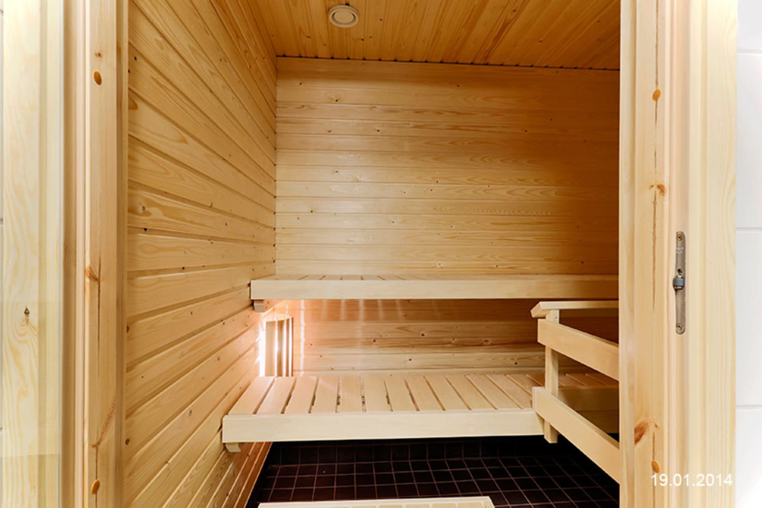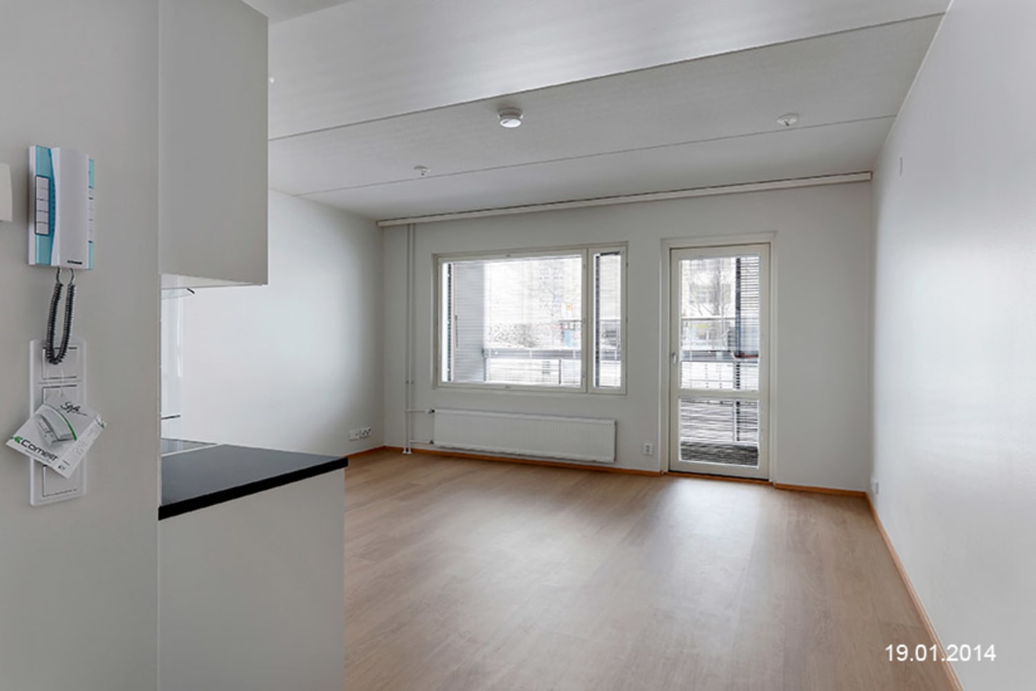 Asuinhuoneiden lattiat ovat valkaistua tammilaminaattia. Keittiökaapistot ovat valkoiset, työtaso taivereunaista mustaa laminaattia ja kalustevälissä valkoinen kaakelointi. Varusteina astianpesukone, keraaminen liesi ja jää-pakastinkaappi.