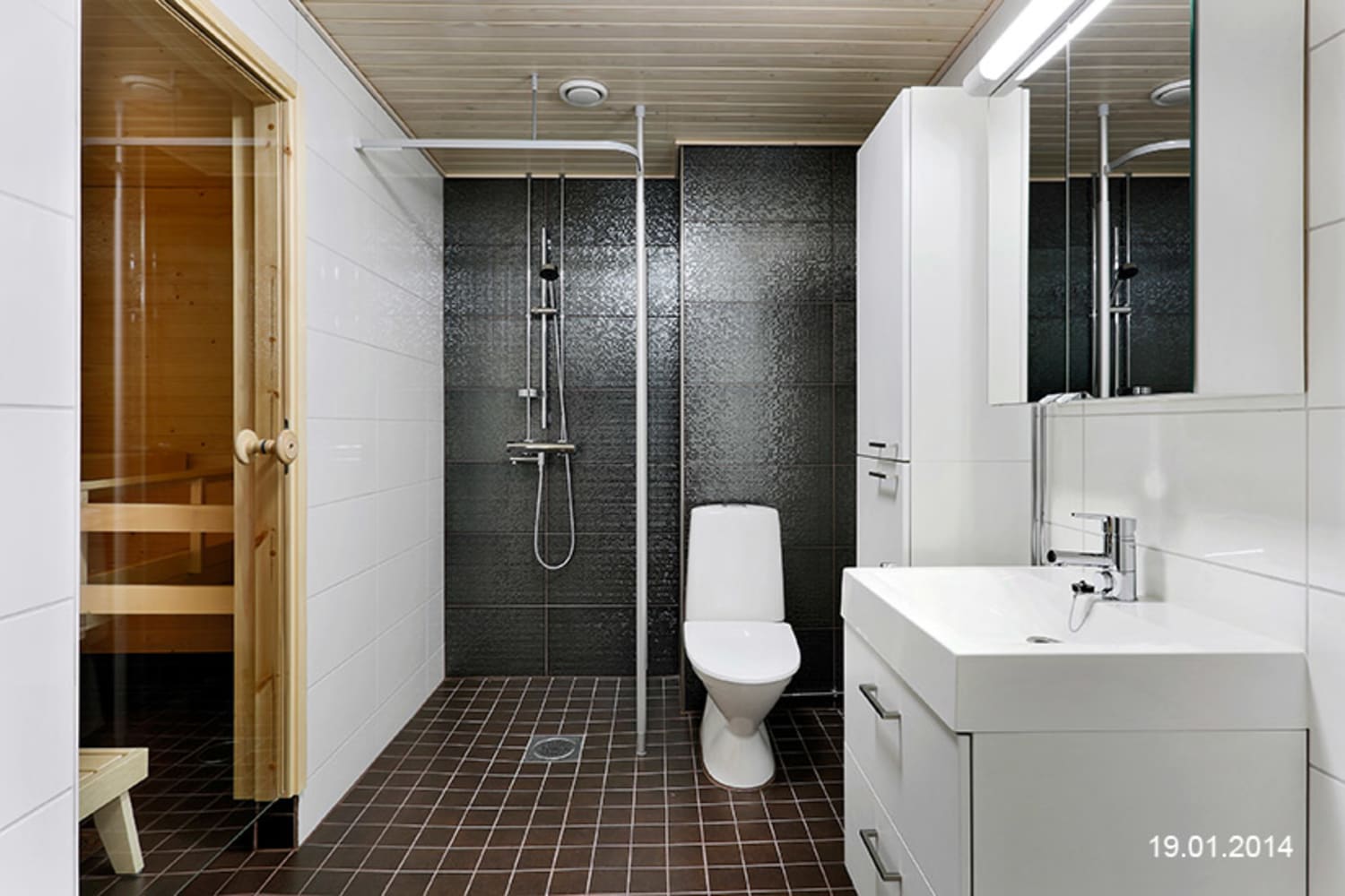 Lämminsävyisessä kylpyhuoneessa on pehmeänruskea laattalattia mukavuuslämmityksellä, kolme seinää sileällä valkoisella kaakeloinnilla sekä suklaanruskealla mosaiikkipintaisella laatalla kaakeloitu tehosteseinä.