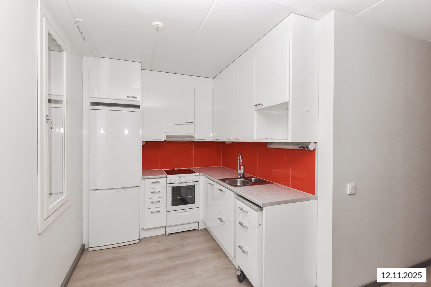 Keittiötilassa on valkoiset kaapit ja harmaan metallisävyinen laminaattityötaso. Kaapiston ja tason välinen tila on laatoitettu herkullisen punaisella laatalla. Keittiön varusteisiin kuuluu valkoinen jääkaappipakastin ja keraaminen liesi. Kylpyhuoneen seinäkaakelit ovat vihreät ja lattialaatoitus on musta. Pyykinpesukoneelle ja kuivausrummulle on tilavaraus.