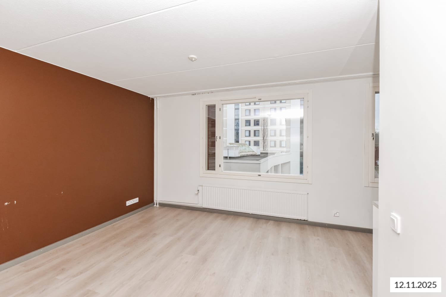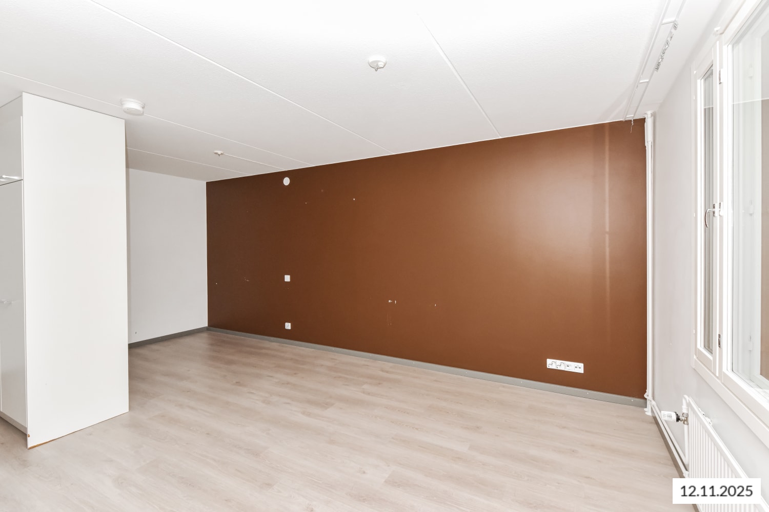 Retrohenkeen remontoitu selkeä yksiö valloittaa värimaailmallaan. Lattiapinnat ovat vaaleanharmaan tammen sävyistä laminaattia ja olohuonetta elävöittää yksi ruskeaksi maalattu seinä. Eteisen kaapistot rajaavat oleskelutilaan mukavan alkovin, josta voit sisustaa makuusopen tai vaikka kotitoimiston.