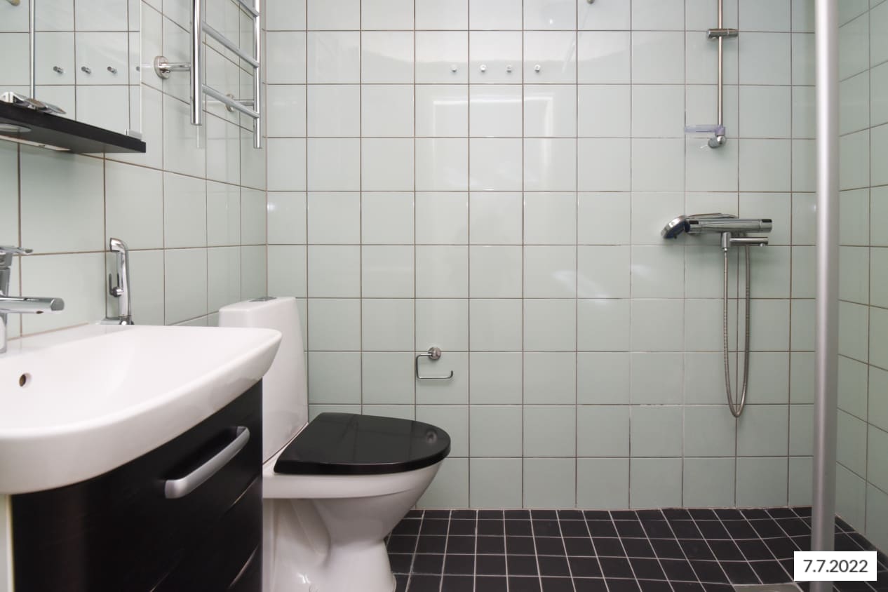 keraaminen liesi. Kylpyhuoneen seinäkaakelit ovat vihreät ja lattialaatoitus on