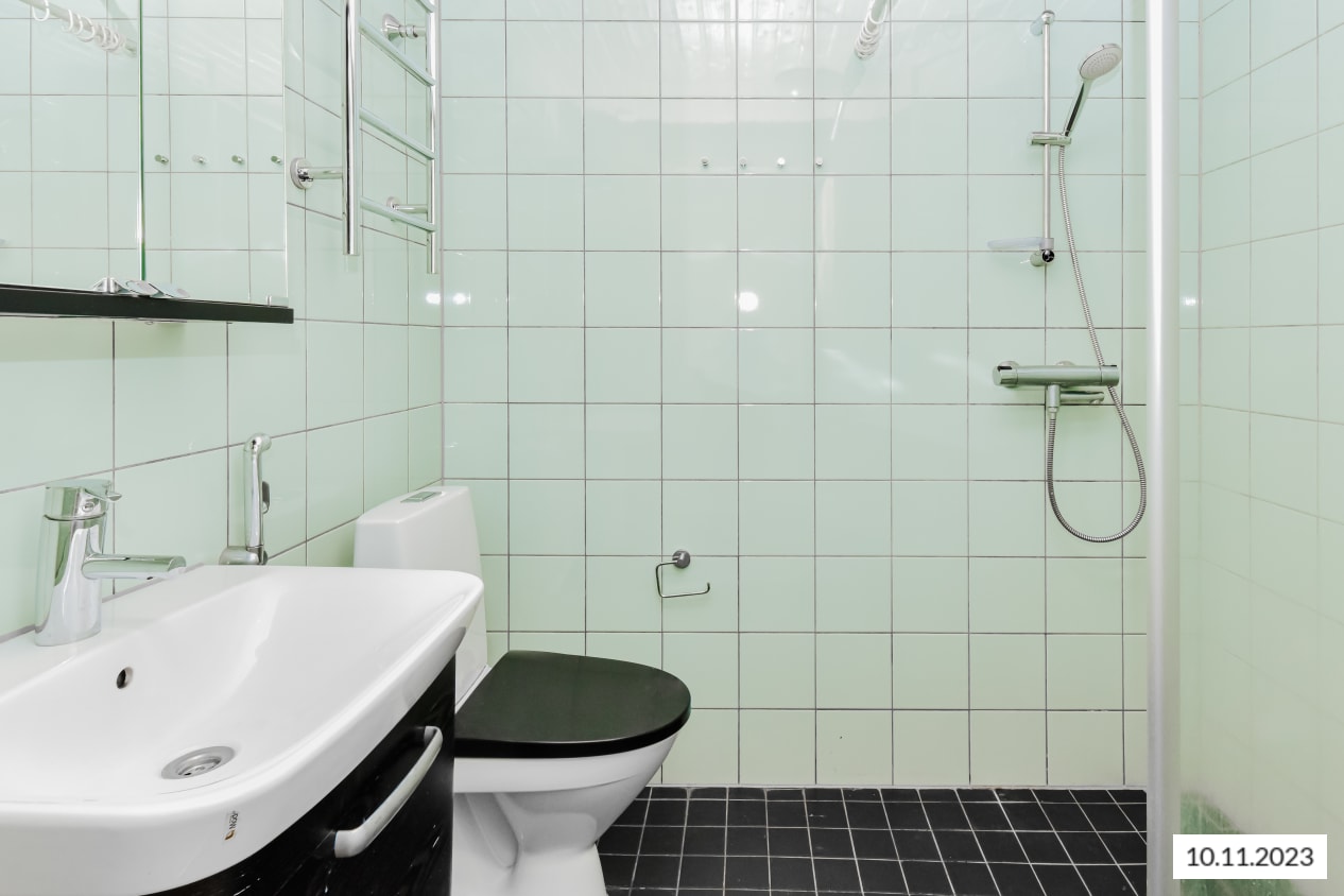 Retrohenkeen remontoitu selkeä kaksio valloittaa värimaailmallaan. Lattiapinnat ovat vaaleanharmaan tammen sävyistä laminaattia ja olohuonetta elävöittää yksi ruskeaksi maalattu seinä. Keittokomerossa on valkoiset kaapit ja harmaan metallisävyinen laminaattityötaso. Kaapiston ja tason välinen tila on laatoitettu herkullisen punaisella laatalla. Keittiön varusteisiin kuuluu valkoinen jääkaappipakastin ja keraaminen liesi. Kylpyhuoneen seinäkaakelit ovat vihreät ja lattialaatoitus on musta.