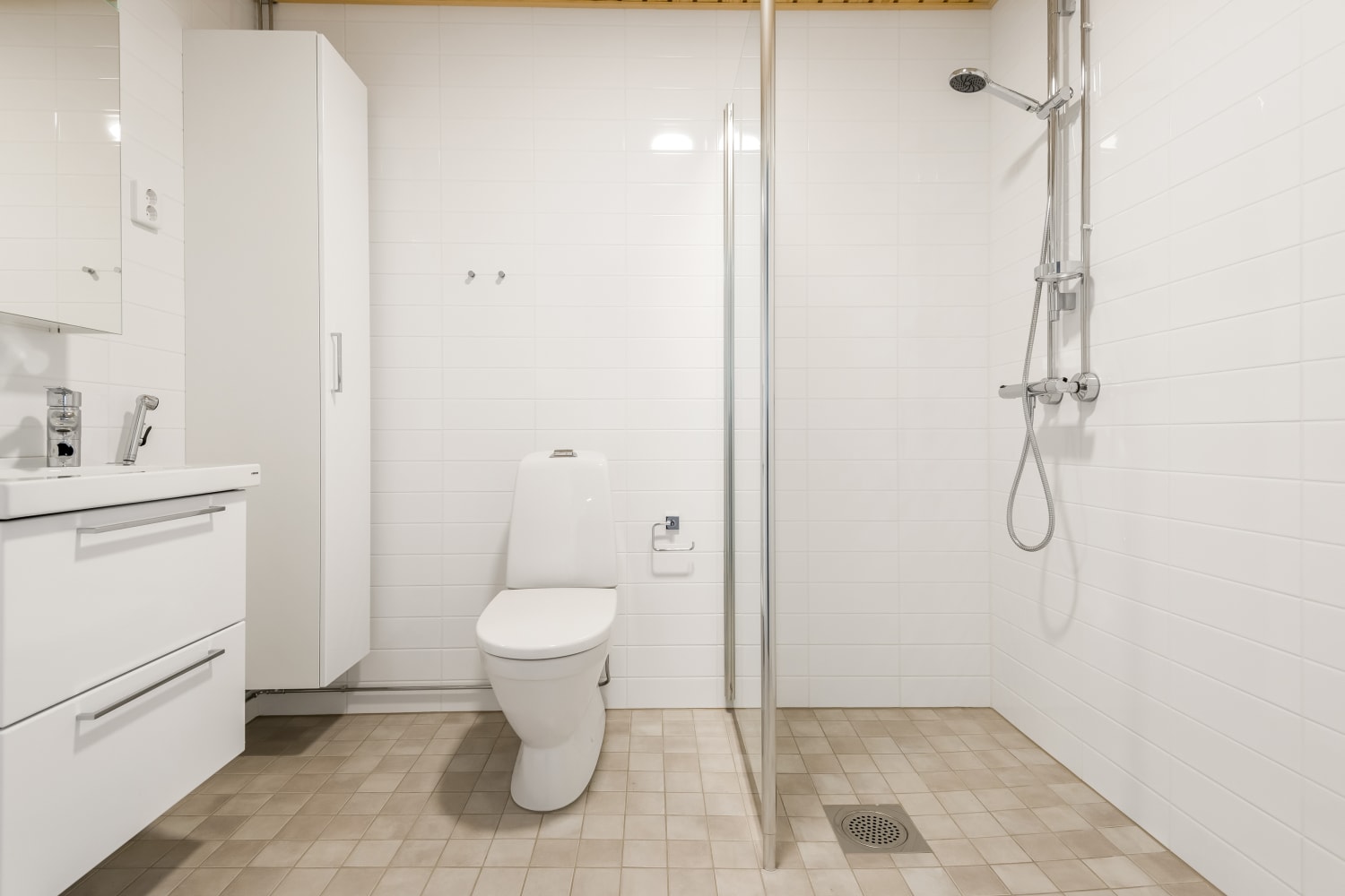Asuintilojen lattiat ovat kodikkaasti tammen sävyistä laminaattia. Makuuhuoneissa on valkoiset komerot ja eteisen liukuovikaapistoissa on peiliovet. Keittiössä kaapistojen ovet ovat raikkaan valkoiset ja ylä- ja alakaappien välinen tila on laatoitettu vaalean vihertävillä laatoilla. Työtaso on puhtaan valkoista laminaattia. Varustukseen kuuluu keraaminen keittotaso ja erillisuuni, astianpesukone ja kylmälaitteet. Kokonaan laatoitetun kylpyhuoneen sävyt ovat vaaleat. Pesukoneelle ja kuivausrummulle on varaus.