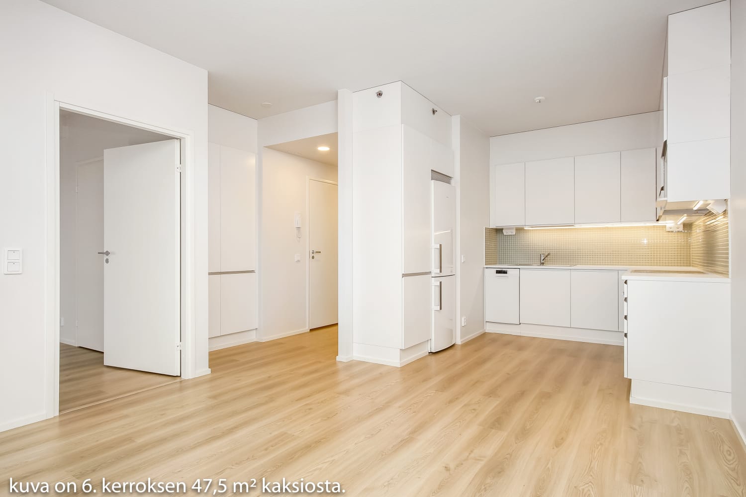 Asuintilojen lattiat ovat kodikkaasti tammen sävyistä laminaattia. Makuuhuoneissa on valkoiset komerot ja eteisen liukuovikaapistoissa on peiliovet. Keittiössä kaapistojen ovet ovat raikkaan valkoiset ja ylä- ja alakaappien välinen tila on laatoitettu vaalean vihertävillä laatoilla. Työtaso on puhtaan valkoista laminaattia. Varustukseen kuuluu keraaminen keittotaso ja erillisuuni, astianpesukone ja kylmälaitteet. Kokonaan laatoitetun kylpyhuoneen sävyt ovat vaaleat. Pesukoneelle ja kuivausrummulle on varaus.