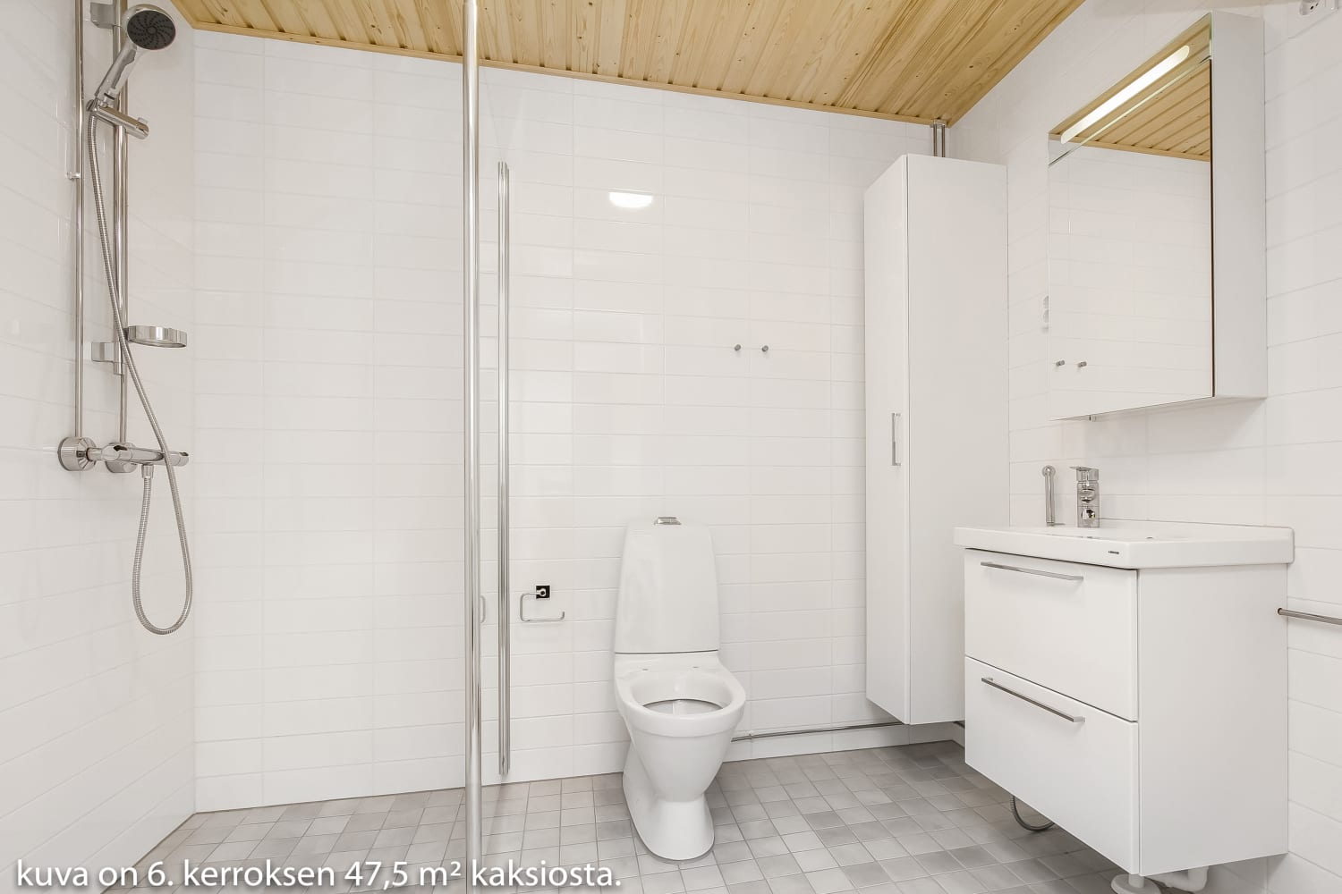 Selkeästi jäsennelty kaksio on helppo kalustaa toimivaksi kodiksi. Ruokapöytä sopii mukavasti avoimen keittiön jatkeeksi. Makuuhuoneessa on ylellisen paljon vaatteiden säilytystilaa erillisessä vaatehuoneessa. Lasitetulta parvekkeelta on näkymä Merituulentien suuntaan.