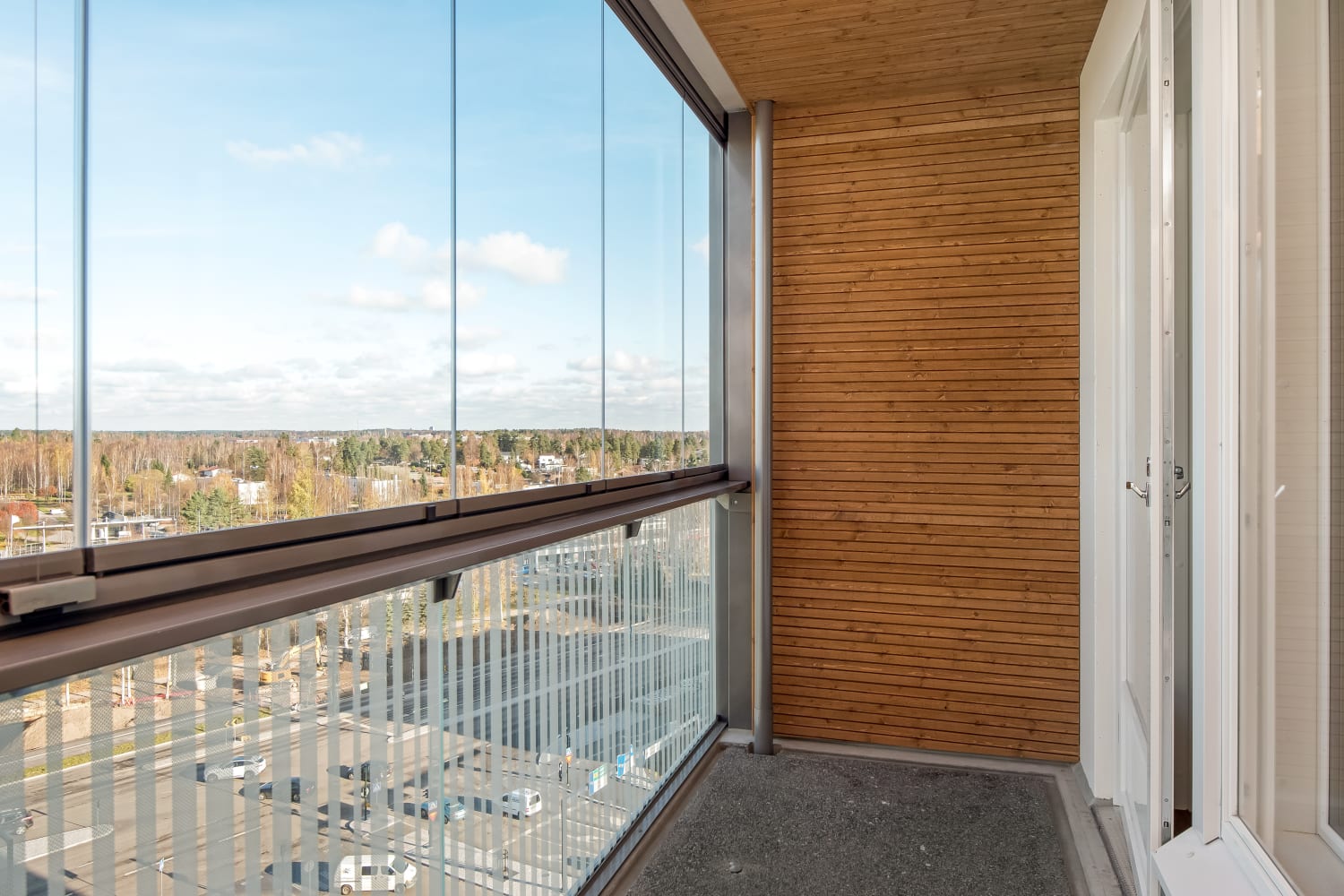 Korkealle kohoavan pikkukodin pohjaratkaisu on avoin ja käytännöllinen. Kaapistot on ryhmitelty selkeästi toiselle seinustalle ja asunnon toinen puoli on avointa tilaa, joka on helppo kalustaa oman maun mukaisesti. Merituulentien suuntaan aukeava lasitettu parveke sopii niin ruukkupuutarhurin keitaaksi kuin leppoisaksi kahvittelupaikaksi.