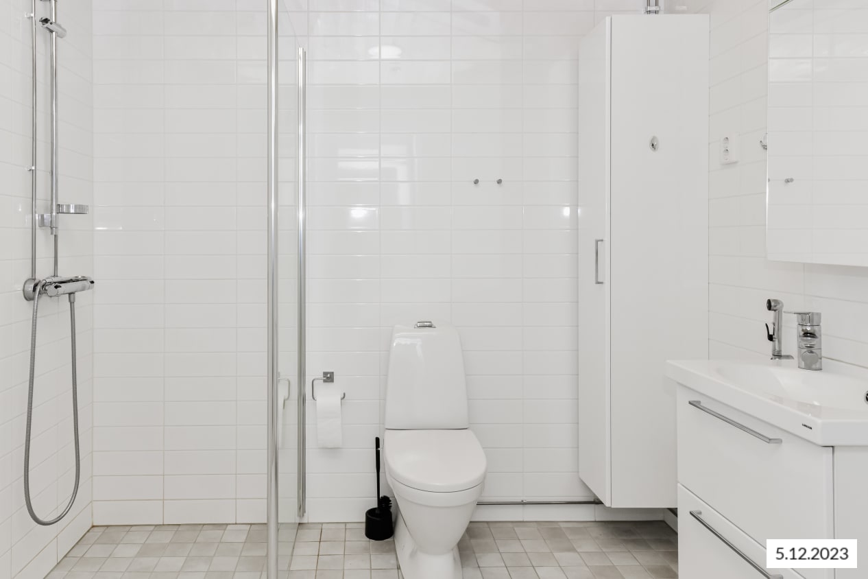 Asuintilojen lattiat ovat kodikkaasti tammen sävyistä laminaattia. Makuuhuoneissa on valkoiset komerot ja eteisen liukuovikaapistoissa on peiliovet. Keittiössä kaapistojen ovet ovat raikkaan valkoiset ja ylä- ja alakaappien välinen tila on laatoitettu vaalean vihertävillä laatoilla. Työtaso on puhtaan valkoista laminaattia. Varustukseen kuuluu keraaminen keittotaso ja erillisuuni, astianpesukone ja kylmälaitteet. Kokonaan laatoitetun kylpyhuoneen sävyt ovat vaaleat. Pesukoneelle ja kuivausrummulle on varaus.
