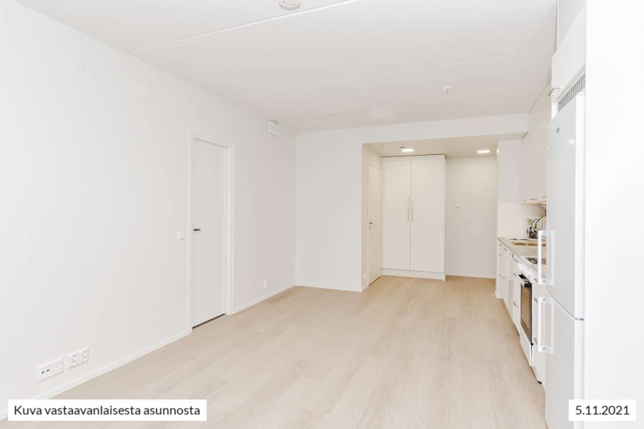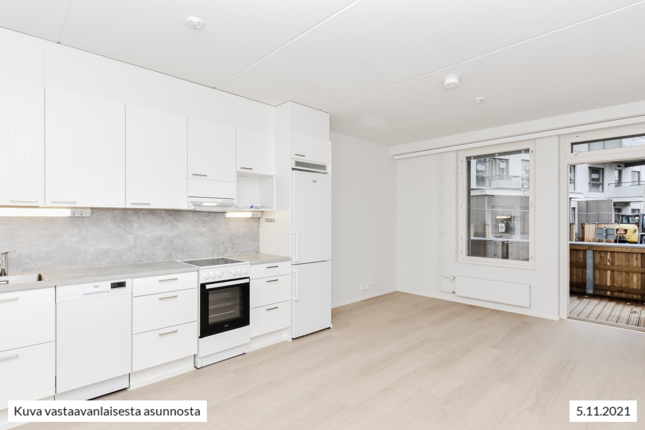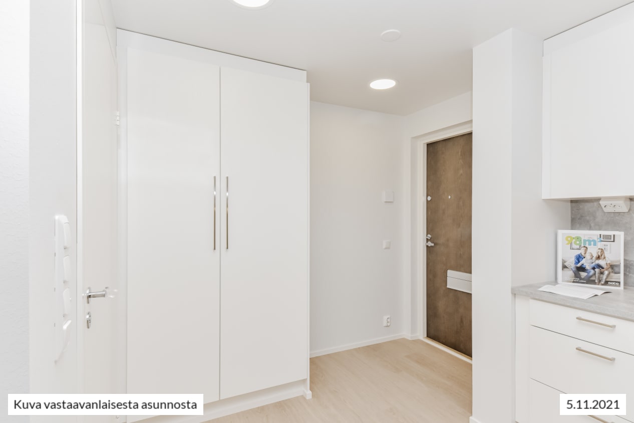 Tämän uuden ja selkeälinjaisen kaksion keittiö ja olohuone muodostavat toimivan ja nykyaikaisen kokonaisuuden, jonka sisustat helposti mieluisaksi. Makuuhuoneeseen pääsee kätevästi kahdesta oviaukosta ja reilusti vaatesäilytystilaa löytyy erillisestä vaatehuoneesta. Kodin pintamateriaalit ovat vaaleita ja pelkistetyn yksinkertaisia. Lattia on tammilaminaattia ja seinät on maalattu valkoisiksi. Linjakkaassa avokeittiössä on vaaleat, puusyykuvioiset kaapistot ja ruokapöytä mahtuu mukavasti keittiön jatkoksi. Ylä- ja alakaappien välinen tila ja työtaso ovat harmaata laminaattia. Varustukseen kuuluu lattialiesi keraamisella tasolla, liesikupu, jääkaappipakastin ja astianpesukone. Kodinkoneet ovat valkoisia. Kylpyhuoneessa on valkoiset SATOn Kide-malliston kalusteet ja paikka pyykinpesukoneelle. Seinät ovat valkoista laattaa ja lattia on harmaa. Lasitettu parveke avautuu ilta-aurinkoon korttelipihan puolelle.