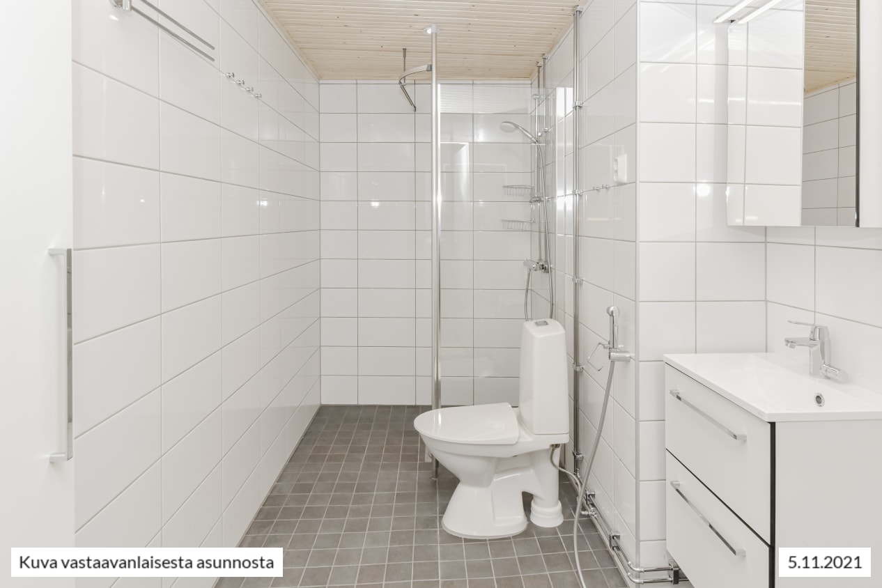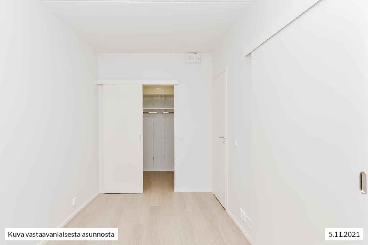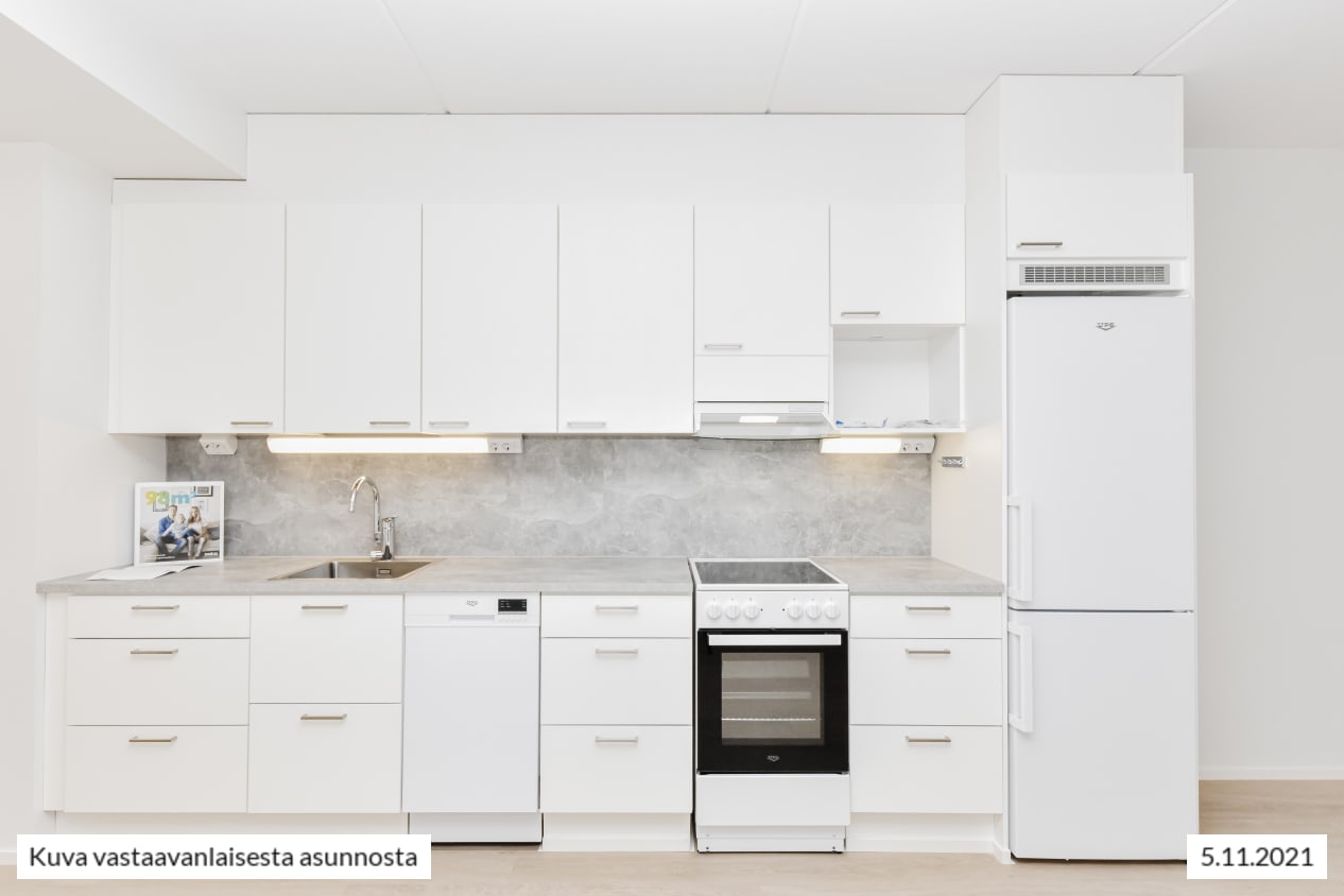 Tämän uuden ja selkeälinjaisen kaksion keittiö ja olohuone muodostavat toimivan ja nykyaikaisen kokonaisuuden, jonka sisustat helposti mieluisaksi. Makuuhuoneeseen pääsee kätevästi kahdesta oviaukosta ja reilusti vaatesäilytystilaa löytyy erillisestä vaatehuoneesta. Kodin pintamateriaalit ovat vaaleita ja pelkistetyn yksinkertaisia. Lattia on tammilaminaattia ja seinät on maalattu valkoisiksi. Linjakkaassa avokeittiössä on vaaleat, puusyykuvioiset kaapistot ja ruokapöytä mahtuu mukavasti keittiön jatkoksi. Ylä- ja alakaappien välinen tila ja työtaso ovat harmaata laminaattia. Varustukseen kuuluu lattialiesi keraamisella tasolla, liesikupu, jääkaappipakastin ja astianpesukone. Kodinkoneet ovat valkoisia. Kylpyhuoneessa on valkoiset SATOn Kide-malliston kalusteet ja paikka pyykinpesukoneelle. Seinät ovat valkoista laattaa ja lattia on harmaa. Lasitettu parveke avautuu ilta-aurinkoon korttelipihan puolelle.