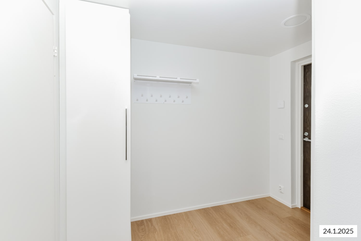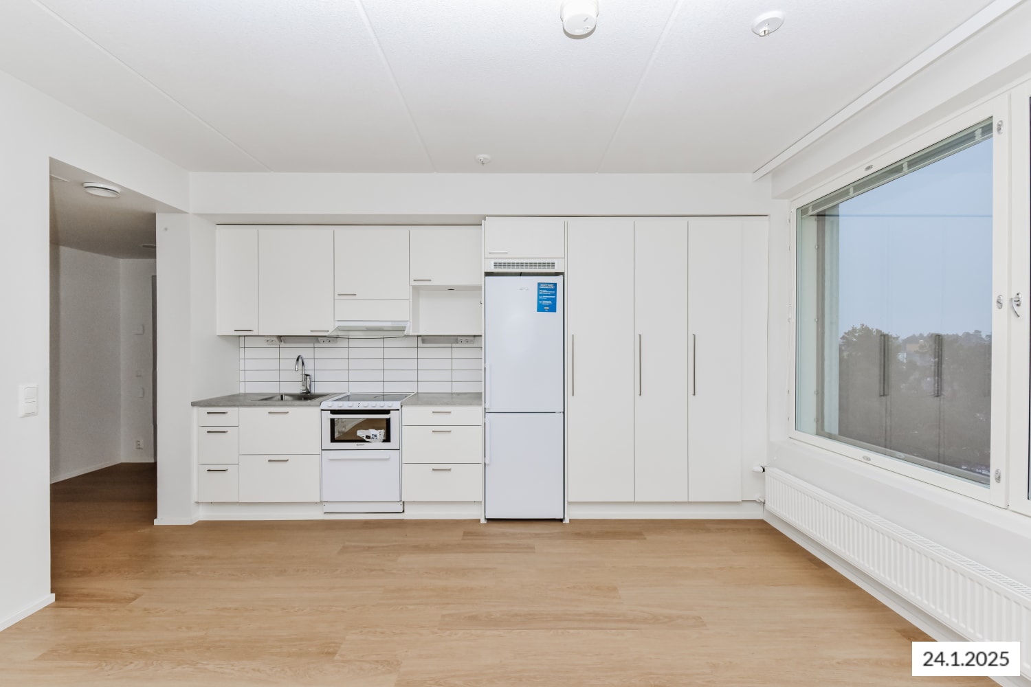 Tämä toimiva yksiö on selkeä ja ajattoman kaunis. Keittiö ja olohuone yhdistyvät avoimeksi oleskelualueeksi ja tilaan ilmavuutta ja luonnon valoa tuovat leveä ikkuna ja ranskalainen parveke. Kodin pintamateriaalit ovat vaaleita ja sopivat moneen makuun. Lattia on tammilaminaattia ja seinät on maalattu valkoisiksi. Linjakkaassa avokeittiössä on vaaleat puusyykuvioiset kaapistot ja harmaa laminaattityötaso. Ylä- ja alakaappien välinen tila on laatoitettu. Varustukseen kuuluu liesi/astianpesukone yhdistelmä ja jääkaappipakastin. Kodinkoneet ovat valkoisia. Kylpyhuoneessa on valkoiset SATOn Kide-malliston kalusteet ja paikka pyykinpesukoneelle. Seinät ovat valkoista laattaa ja lattia on harmaa.