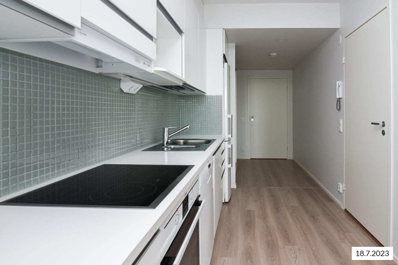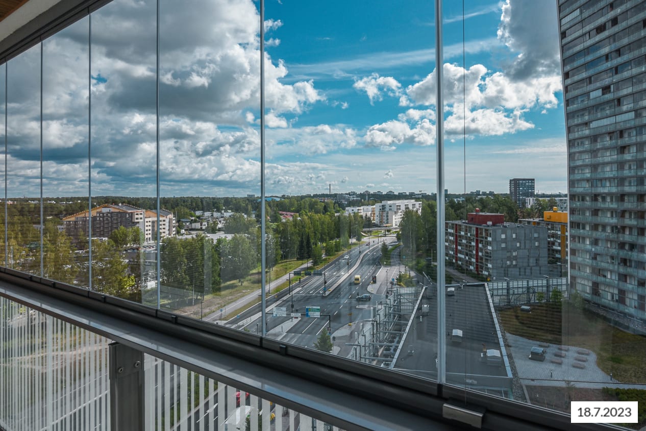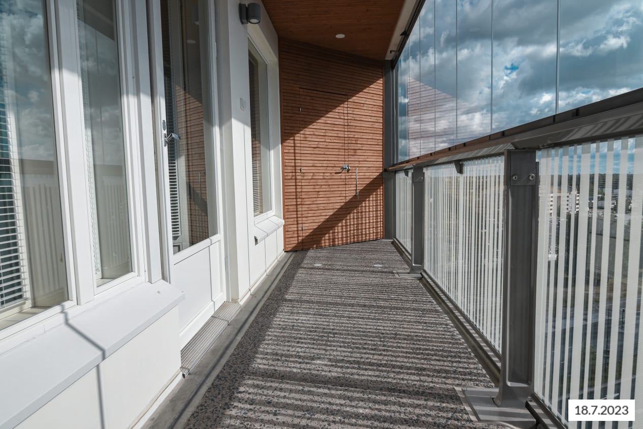 Korkealle kohoava, kaunis kaksio on helppo kalustaa oman maun mukaisesti. Keittiö ja olohuone yhdistyvät avoimeksi olekelualueeksi. Itään suuntautuvalta lasitetulta parvekkeelta on näkymät pihan ja kauppakeskuksen suuntaan. Harrastusvälineille sopiva varastotila löytyy parvekkeen nurkkauksesta.