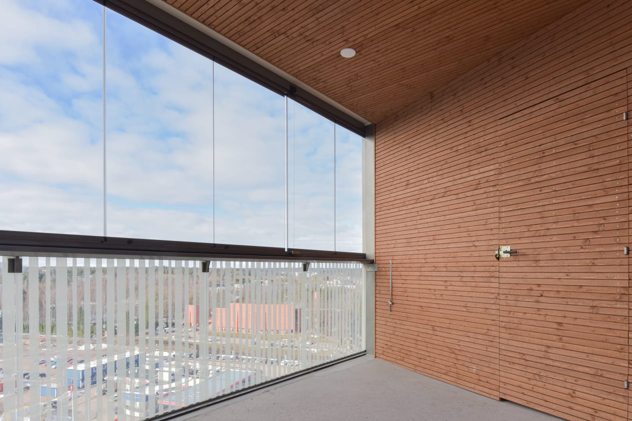 Korkealle kohoavan vaaleasävyisen pikkukodin pohjaratkaisu on avoin ja käytännöllinen. Kaikki kaapistot on ryhmitelty selkeästi toiselle seinustalle ja asunnon toinen puoli on helppo kalustaa mieleiseksi. Länteen suuntautuvalta lasitetulta parvekkeelta on näkymät Merituulentien suuntaan. Esimerkiksi harrastusvälineille sopiva varastotila löytyy parvekkeen nurkkauksesta.
