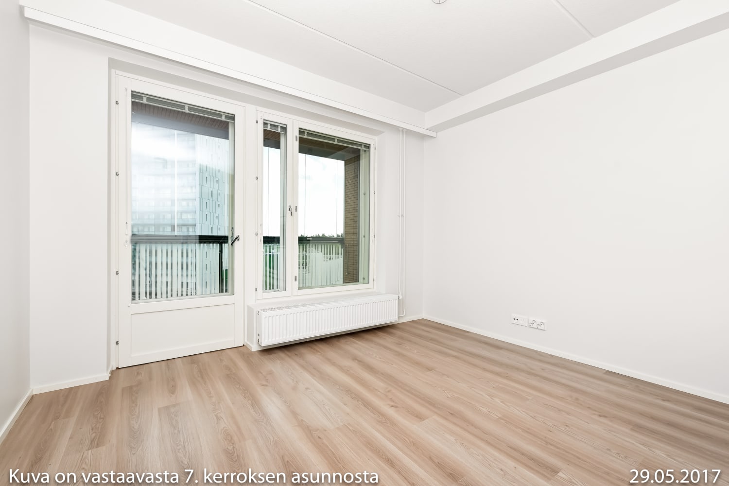 Korkealle kohoava, kaunis kaksio on helppo kalustaa oman maun mukaisesti. Keittiö ja olohuone yhdistyvät avoimeksi oleskelualueeksi. Itään suuntautuvalta lasitetulta parvekkeelta on näkymät pihan ja kauppakeskuksen suuntaan. Harrastusvälineille sopiva varastotila löytyy parvekkeen nurkkauksesta.